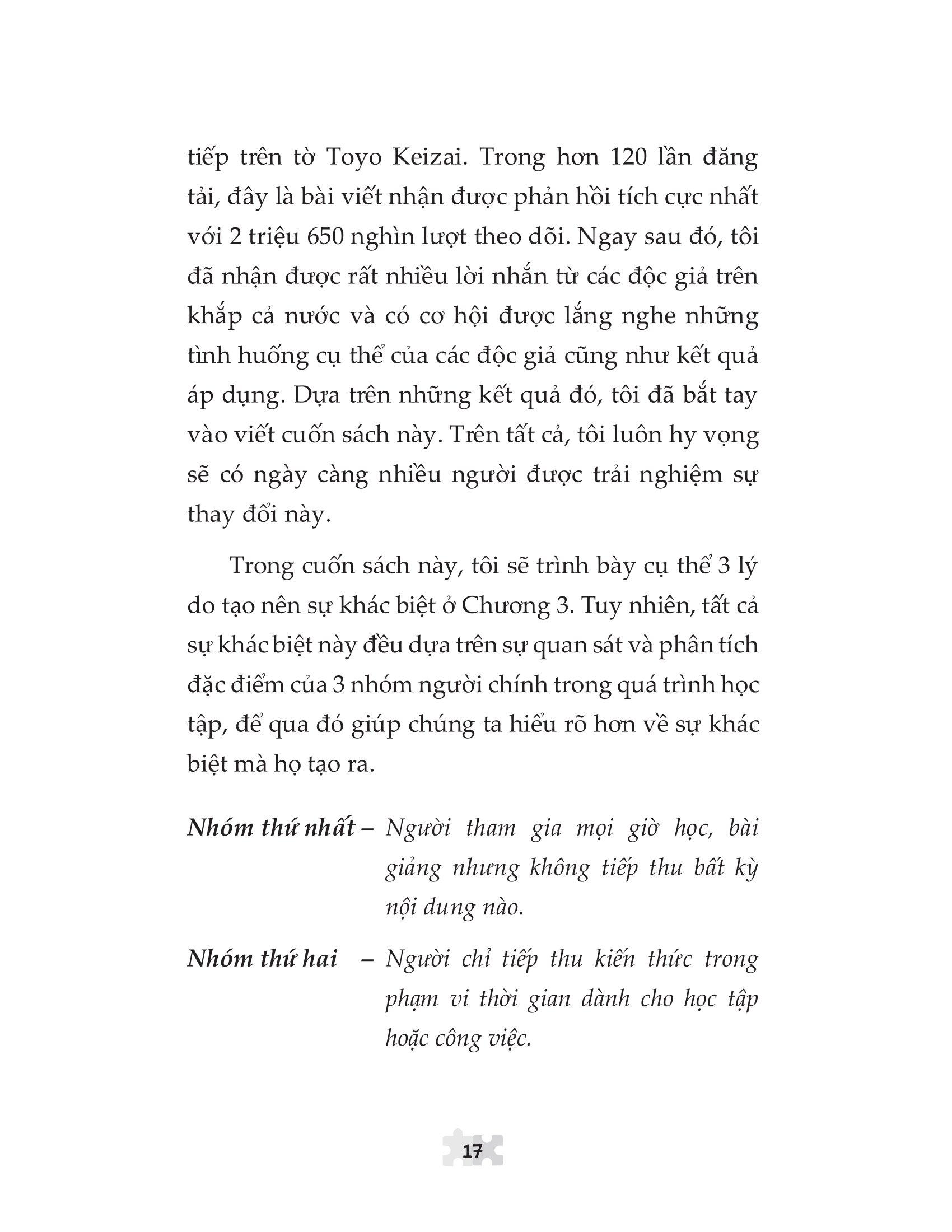 - Làm thế nào để học tập, làm việc đạt được kết quả cao hơn? Nó có thể do bẩm sinh nhưng cũng có thể do sự khác biệt về phương pháp học tập hay làm việc. Một khi tìm được nguyên nhân, bạn sẽ nhận ra phương hướng cho sự nỗ lực của m.ình. Vì vậy, khi kết quả đạt được không như ý, đó không phải là do bạn nỗ lực chưa đủ, mà là do phương hướng bạn lựa chọn đã sai lầm ngay từ đầu. Điều quan trọng chính là tìm ra cách cải thiện não bộ của chính bạn, phương pháp đó được gọi là thuật “hack não”. Một khi “thông số kỹ thuật” của hệ điều hành não bộ được cải thiện, hành động so sánh này sẽ dần được giảm thiểu, đồng thời, mong muốn tự khẳng định bản thân cũng nâng cao. Khi mong muốn tự khẳng định bản thân được nâng cao, bạn sẽ hoà nhã, thân thiện hơn với những người xung quanh bởi khi đó bạn hài lòng với chính m.ình. Con người có xu hướng tìm kiếm những điểm tương đồng với tâm hồn, vì thế khi bạn hài lòng với chính m.ình, bạn sẽ nhìn thấy những điểm tốt, những điều tuyệt vời ở đối phương. Ngược lại, khi bạn bất mãn với chính bản thân m.ình, bạn sẽ chỉ nhìn thấy những khiếm khuyết, những thiếu sót của họ. Do đó, nâng cao mong muốn tự khẳng định bản thân cũng là một yếu tố quan trọng giúp bạn cảm thấy hài lòng, thoả mãn hơn với chính m.ình. Vậy, hãy tìm kiếm phương pháp giúp đánh thức tiềm năng não bộ, tăng cường khả năng tư duy, tìm ra sức hấp dẫn của riêng bạn, tìm kiếm những phần tốt đẹp hơn so với bạn trong quá khứ và phát triển chúng. Tác giả: Katsunori Ishida là Giám đốc đại diện Phòng Nghiên cứu thiết kế chương trình giáo dục tại Nhật Bản. Ông đã tổ chức rất nhiều chương trình như Mama Café, các buổi diễn thuyết, viết sách… với mong muốn “giảm thiểu tình trạng trẻ em chán ghét việc học”.