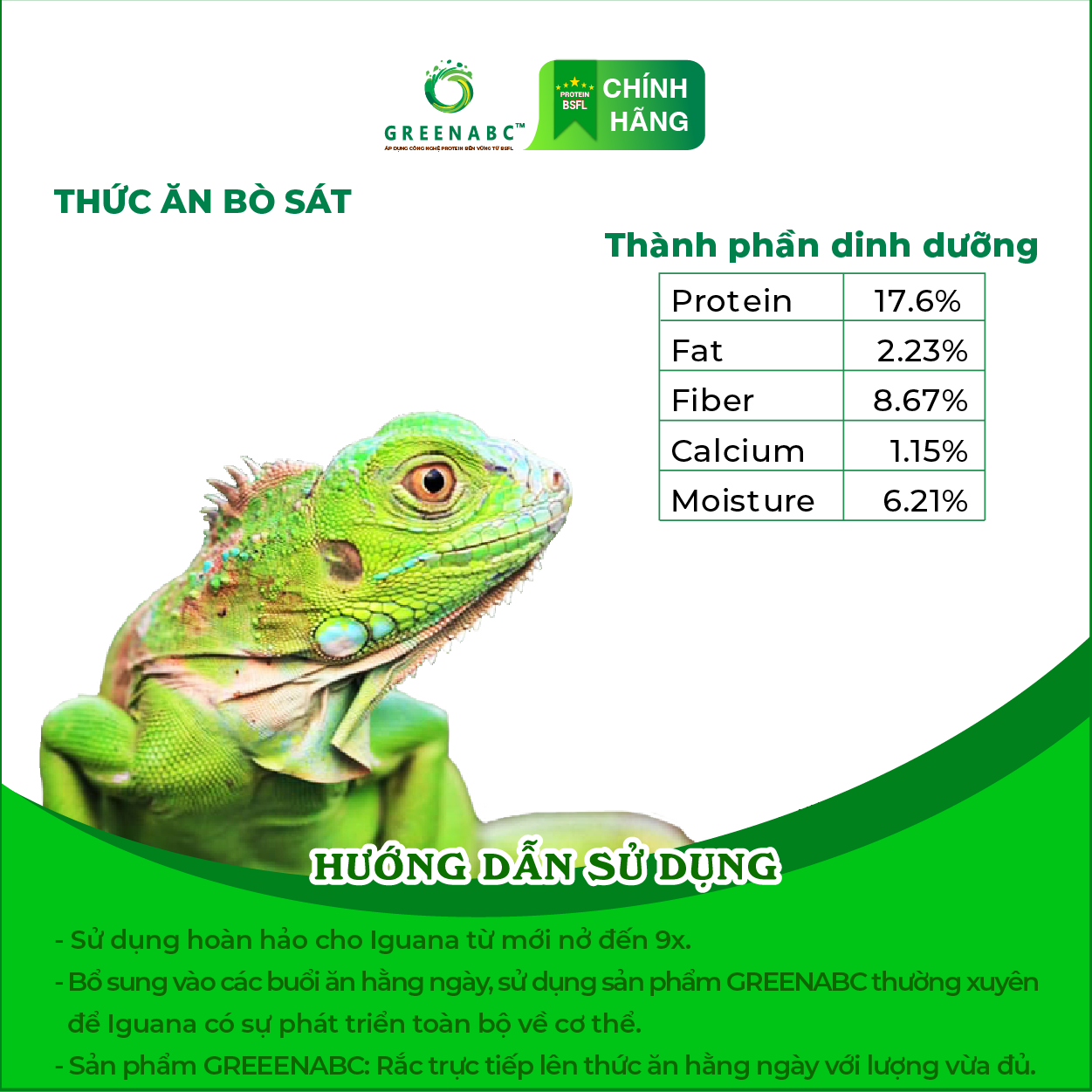 Sản phẩm GREENABC cung cấp các giá trị dinh dưỡng bền vững cho Iguana với sự kết hợp 80% thành phần có nguồn gốc thực vật và 20% thành phần có nguồn gốc động vật từ côn trùng, giúp cho Iguana Baby:      + Lột da thường xuyên, tăng kích cỡ nhanh, lên màu đẹp.      + Với hàm lượng Canxi 100% nguyên chất có trong BSFL giúp gai bung, đều, ngăn ngừa các bệnh thường gặp như teo đuôi, MBD, sạn, ...      + Kích thích khứu giác, tăng cường vị giác, giúp Iguana ăn ngon miệng hơn. Đặc biệt với hương thơm tự nhiên, Greenabc kích thích khứu giác của các Iguana Abino T-, giúp các bé ăn tốt hơn.       + Tiêu hóa tốt, cơ thể hấp thụ toàn bộ dưỡng chất cần thiết, giúp cơ thể phát triển toàn diện.      + Cơ thể săn chắc, khỏe mạnh.      + Giảm thiểu mùi hôi của phân và cơ thể.