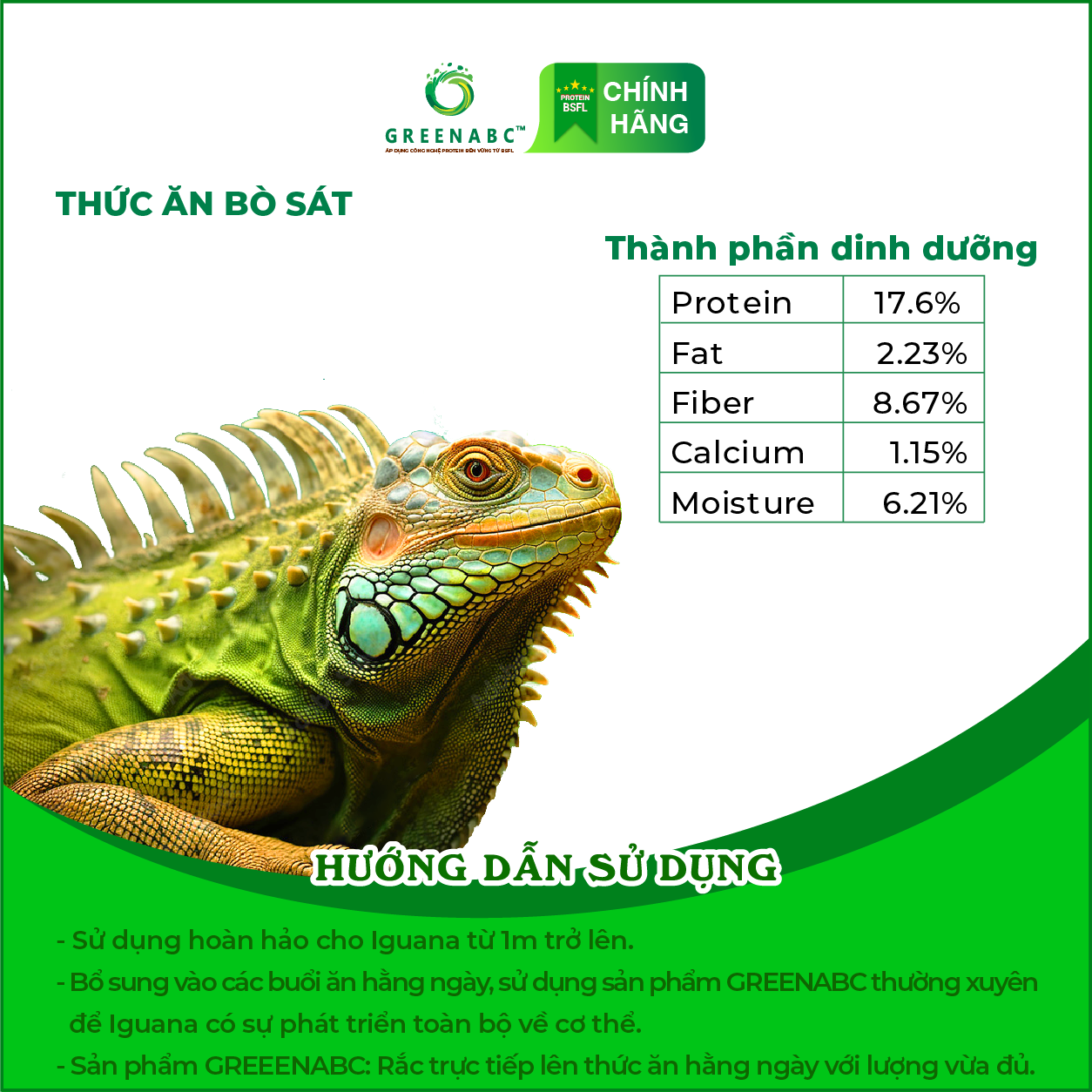GREENABC là thức ăn cao cấp dành cho Iguana Trưởng Thành - Rồng Nam Mỹ Trưởng Thành. Đặc biệt sản phẩm GREENABC được sản xuất theo phương pháp Áp dụng công nghệ PROTEIN bền vững từ bột đạm G.Meal rất giàu PROTEIN – CANXI – LIPID có trong BSFL, đã được Mỹ (AAFCO) và EU chấp nhận đưa vào công thức cho ngành sản xuất thức ăn dành cho vật nuôi.
