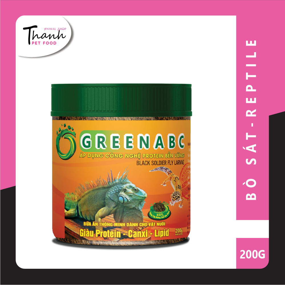 THỨC ĂN BÒ SÁT - BỔ SUNG DINH DƯỠNG PROTEIN, CANXI, LIPID GREENABC là thức ăn cao cấp dành cho các loại bò sát: IGUANA, BEARDED DRAGON, LEOPARD GECKO. Đặc biệt sản phẩm GREENABC được sản xuất theo phương pháp Áp dụng công nghệ PROTEIN BỀN VỮNG từ bột đạm G.Meal rất giàu PROTEIN–CANXI–LIPID có trong BSFL*, đã được Mỹ (AAFCO) và EU chấp nhận đưa vào công thức cho ngành sản xuất thức ăn dành cho thú cưng. Thức ăn dinh dưỡng dành cho các loại BÒ SÁT - Giàu Protein, Canxi và Liqid, giúp các loại Bò Sát: Rồng Nam Mỹ (Iguana), Rồng Úc (Bearded Dragon), Thằn lằn da báo (Leopard Gecko), :    + Miễn dịch tốt.    + Tăng size, cơ thể phát triển toàn diện, săn chắc.    + Kích thích sắc tố, giúp Bò Sát lên màu đẹp    + Kích thích vị giác, ăn ngon miệng hơn trong quá trình mang thai và sinh con.    + Tiêu hóa tốt, tăng cường hấp thụ các dưỡng chất đối với cơ thể giúp ngăn ngừa bệnh tật tối ưu.    + giảm mùi hôi của phân tối ưu. Lưu ý: Khi sử dụng GREENABC - Thức ăn bổ sung dinh dưỡng dành cho các loại bò sát đã cung cấp đầy đủ các dưỡng chất PROTEIN - CANXI - LIPID từ BSFL. Khách hàng KHÔNG CẦN BỔ SUNG THÊM CANXI và D3 cho bò sát.