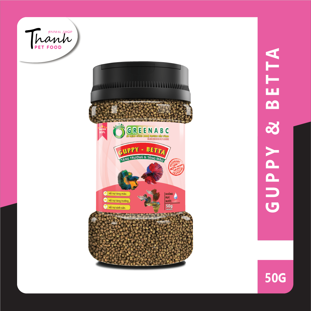 GREENABC là thức ăn cao cấp dành cho cá GUPPY & BETTA. Đặc biệt sản phẩm GREENABC được sản xuất theo phương pháp Áp dụng công nghệ PROTEIN bền vững từ bột đạm G.Meal rất giàu PROTEIN – CANXI – LIPID có trong BSFL, đã được Mỹ (AAFCO) và EU chấp nhận đưa vào công thức cho ngành sản xuất thức ăn cho vật nuôi.