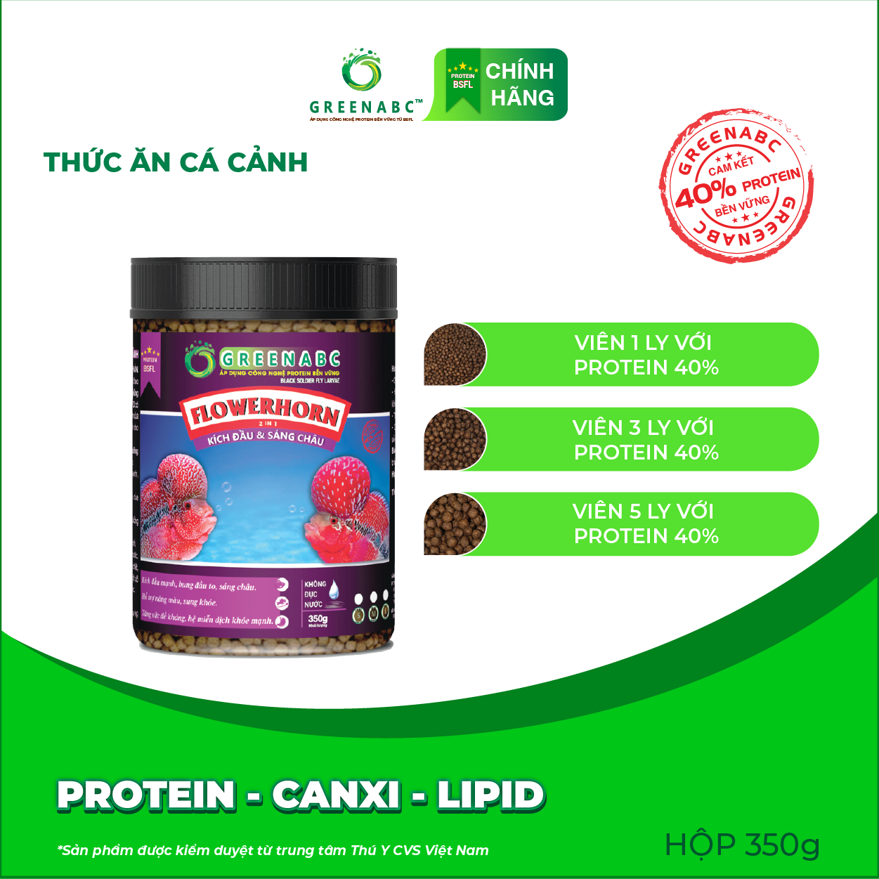 ✨Thức ăn Cá La Hán GREENABC - Flowerhorn Fish – Hàm lượng protein 40% giúp kích bung đầu to, châu sáng, vảy rực rỡ, tăng trưởng nhanh - Hộp 350g