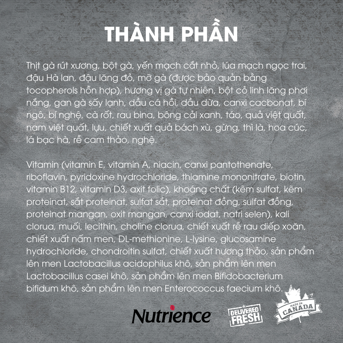 Thành phần: Thịt (gà, ức gà, collagen gà), bột mì, đạm đậu nành, đường, vụn bánh mì, dầu thực vật, lợi khuẩn lactic, glycerin, sorbitol, trehalose, kali sorbate, natri dehydroacetate, khoáng chất (natri), hương liệu,