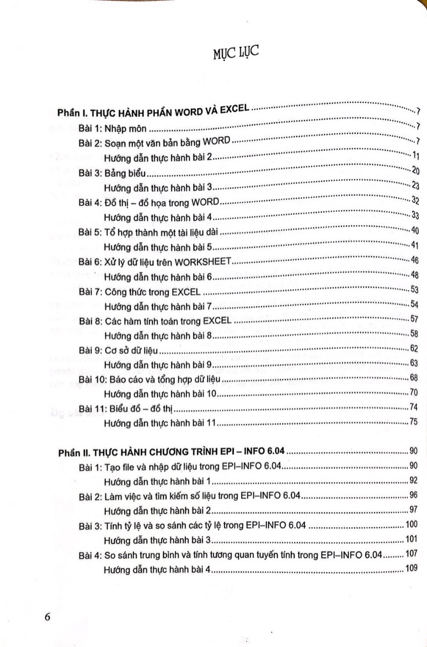 Phần thực hành bao gồm ba phần: Microsoft Word, Microsoft Excel và Epi-Info. Microsoft Word giúp cho sinh viên dễ dàng làm quen với phần mềm soạn thảo văn bản, có khả năng soạn thảo hoàn chỉnh một văn bản như báo cáo khoa học, luận văn tốt nghiệp, v.V… Microsoft Excel giúp xử lý số liệu bằng các hàm, các công cụ có sẵn, tổng hợp phân tích dữ liệu dưới nhiều hình thức khác nhau khá trực quan, linh hoạt và hiệu quả. Các bài thực hành Epi-Info giúp cho sinh viên thực hành phân tích và xử lý số liệu nghiên cứu của Y - sinh học.