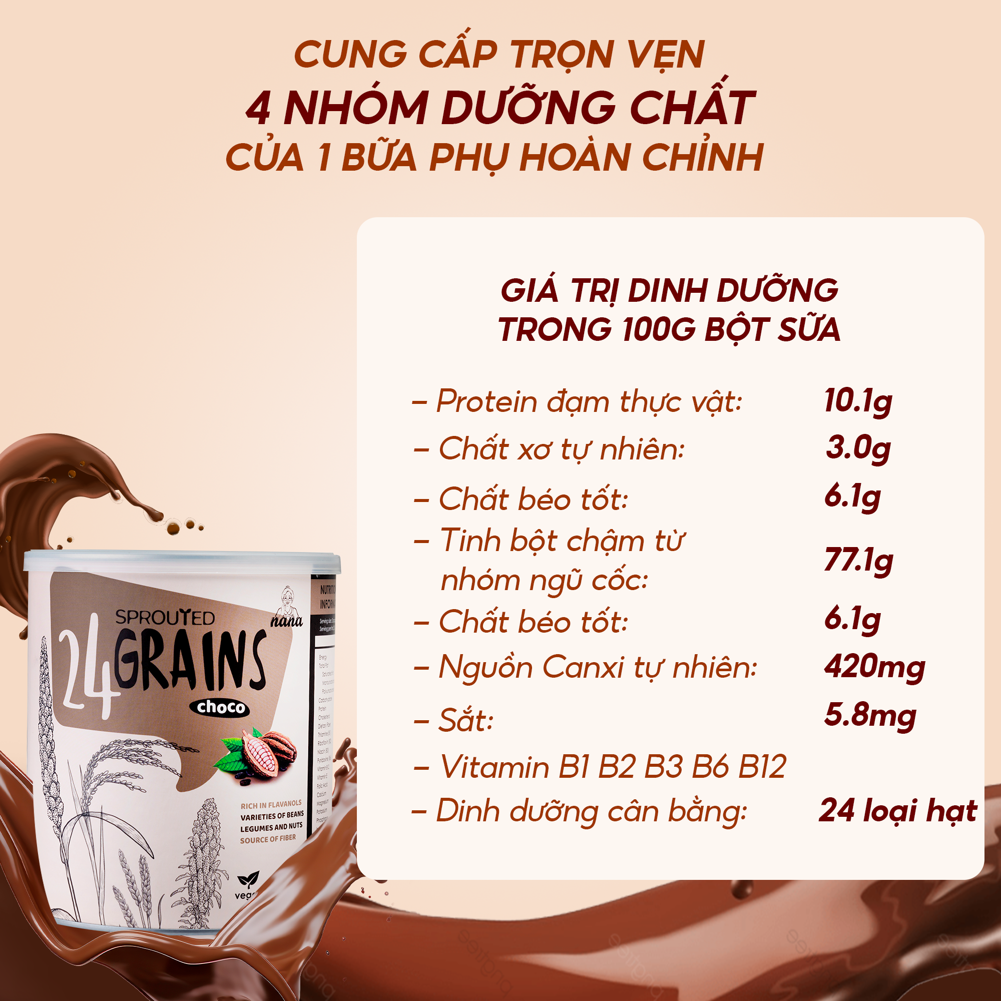 24Grains là dòng sữa bổ sung dinh dưỡng cho những người ăn chay, được chiết xuất hoàn toàn từ các loại hạt và ngũ cốc dinh dưỡng trên dây chuyền công nghệ hiện đại từ Malaysia