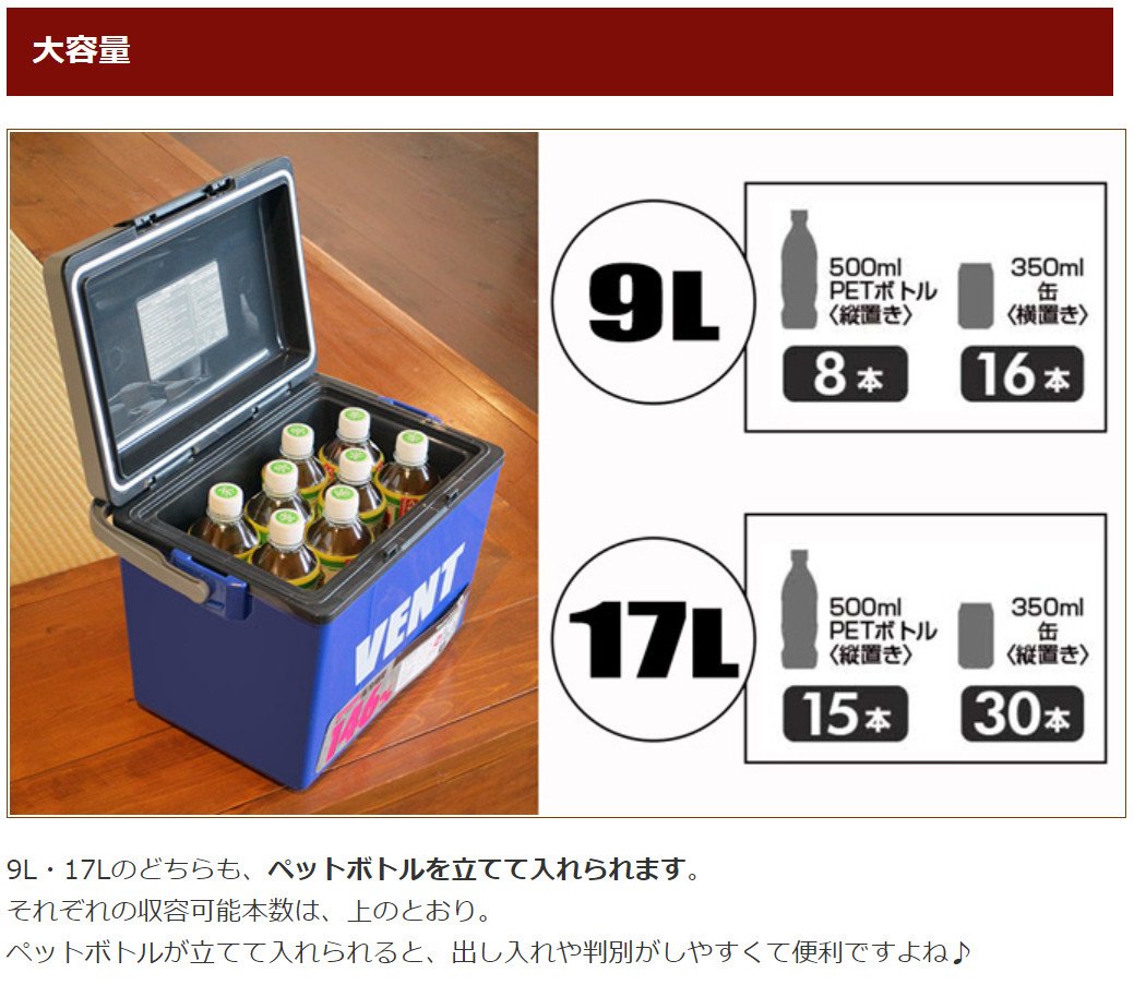 Thùng đựng đá giữ nhiệt đa năng Vent 17l, lớp cách nhiệt bằng xốp EPS cao cấp-nội địa Nhật Bản Kích thước: 17L: 48×30×32.5Hcm (36×19×26Hcm) Trọng lượng: 17 lít ~ 2180g Chất liệu: Thân/ nắp/