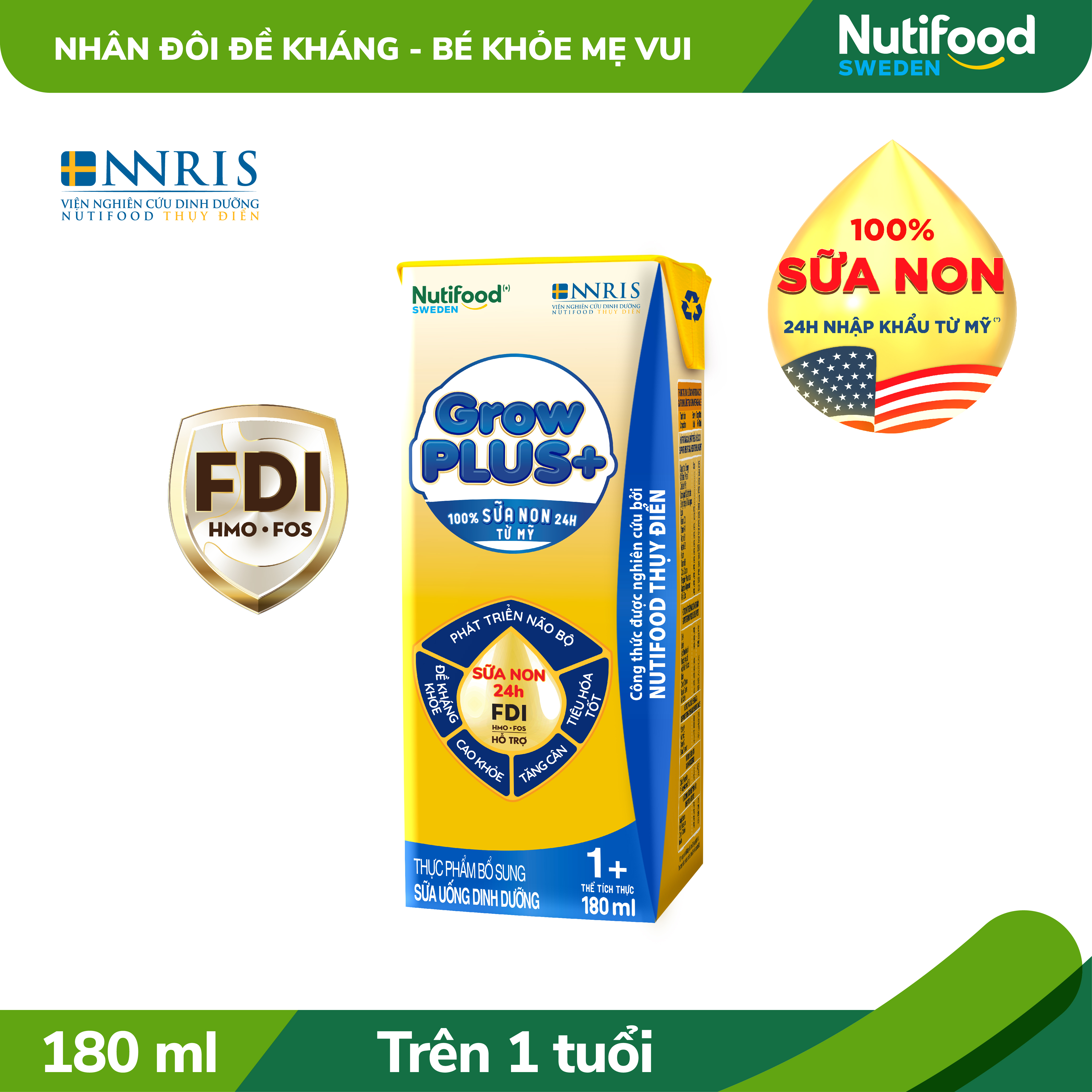 Nutifood Sweden GrowPLUS+ chứa Sữa non 24 giờ có công thức được phát triển bởi Viện nghiên cứu dinh dưỡng Nutifood Thụy Điển (NNRIS), xây dựng nền tảng FDI Đề kháng khỏe, tiêu hóa tốt giúp trẻ hấp thu các dưỡng chất. Nay bổ sung 100% Sữa non 24h tự nhiên từ Mỹ cùng 2'-FL HMO giúp tăng cường đề kháng, tạo nền tảng vững chắc cho bé cao lớn và phát triển não bộ.  THÀNH PHẦN (INGREDIENTS): Nước, sữa bột (9 %), đường, chất béo sữa, maltodextrin, chất béo thực vật, chất xơ thực phẩm (FOS (0,27 %), Inulin), chất ổn định (466, 460(i), 407, 471), sữa non (1000 mg/L), hỗn hợp vitamin và khoáng chất (A, D3, C, E, K1, B1, B3, B5, B6, B12, acid folic, kẽm oxyd, biotin, kali iodid, inositol), hương liệu tổng hợp, cholin, DHA từ dầu cá, 2'-Fucosyllactose (2'-FL), taurin, lutein. Có chứa sữa, đậu nành, dầu cá. Không sử dụng chất bảo quản.  LỢI ÍCH SẢN PHẨM: