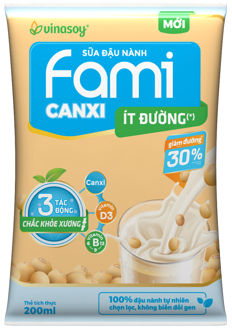 Dẻo dai, đẹp dáng, khỏe xương cùng Fami Sữa đậu nành ít đường Fami Canxi bịch 200ml là sản phẩm ít đường dạng bịch 200ml tiện dụng bổ sung thêm canxi nhưng vẫn được làm từ 100% hạt đậu nành, nhưng Fami Canxi được bổ sung thêm canxi và vitamin D3, tăng khả năng hấp thụ canxi, giúp cho hệ xương chắc khỏe. Fami mang đến tinh túy đậu nành cho mọi người Fami cam kết không ngừng sáng tạo và tối ưu hóa nguồn dinh dưỡng quý báu từ đậu nành thiên nhiên để mang đến cộng đồng cơ hội sử dụng phổ biến các sản phẩm chất lượng tốt nhất có nguồn gốc từ đậu nành. Nhờ đó, không chỉ chúng tôi mà đối tác và cộng đồng xung quanh sẽ có được một cuộc sống ý nghĩa hơn, tốt đẹp hơn và thịnh vượng hơn” Nỗ lực không mệt mỏi nhằm đem đến những sản phẩm dinh dưỡng tối ưu nhất từ nguồn đậu nành thiên nhiên đến cho người tiêu dùng. Luôn đi đầu trong nghiên cứu và ứng dụng khoa học tiên tiến trong công nghệ chế biến đậu nành nhằm cho ra đời những thương hiệu mạnh, uy tín.Tự hào là một thương hiệu Việt, được kế thừa những giá trị tốt đẹp “tương thân tương ái”, “uống nước nhớ nguồn” của người Việt Nam Hướng dẫn sử dụng