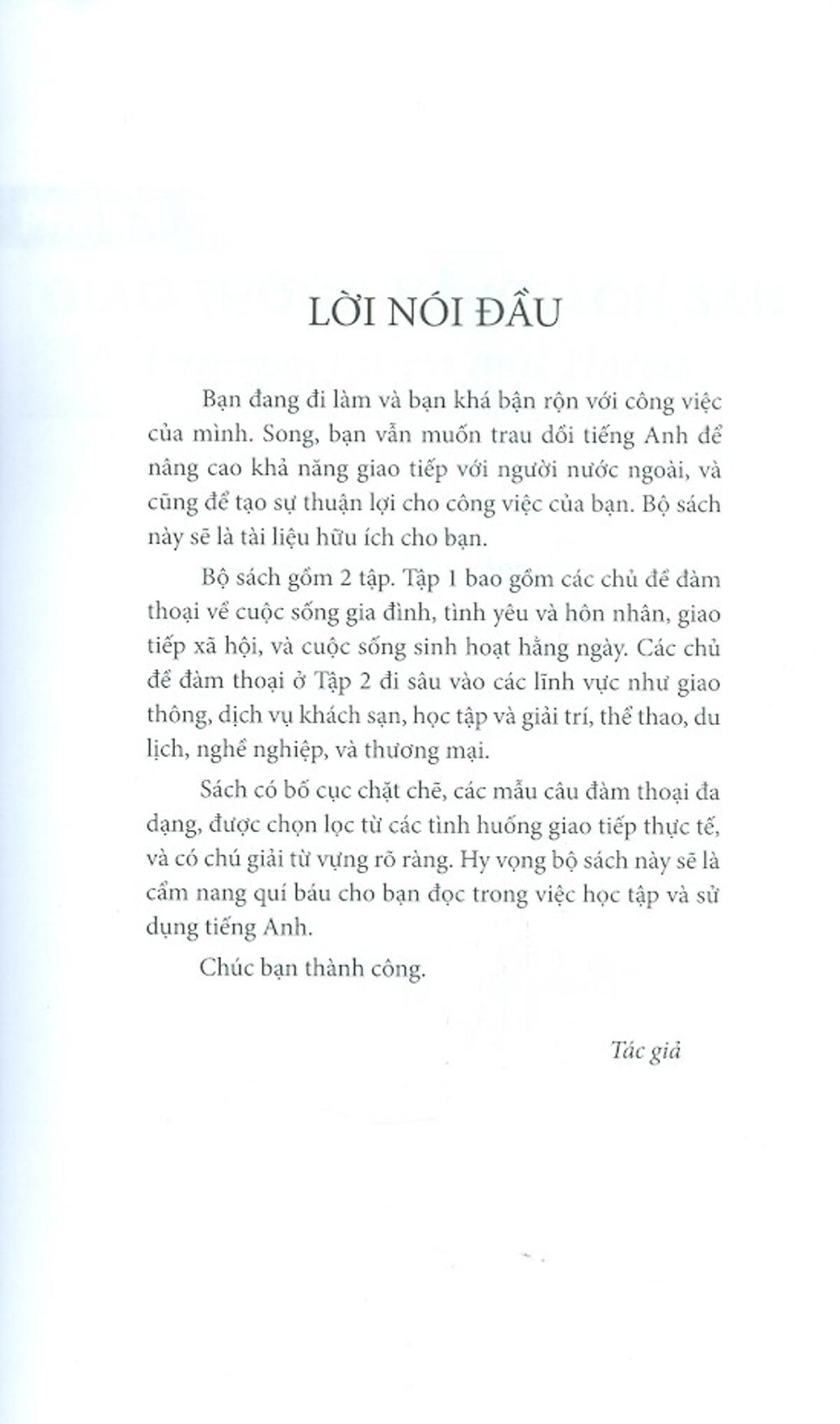 Sách có bố cục chặt chẽ, các mẫu câu đàm thoại đa dạng, được chọn lọc từ các tình huống giao tiếp thực tế, và có chú giải từ vựng rõ ràng. Hy vọng bộ sách này sẽ là cẩm nang quí báu cho bạn đọc trong việc học tập và sử dụng tiếng Anh.