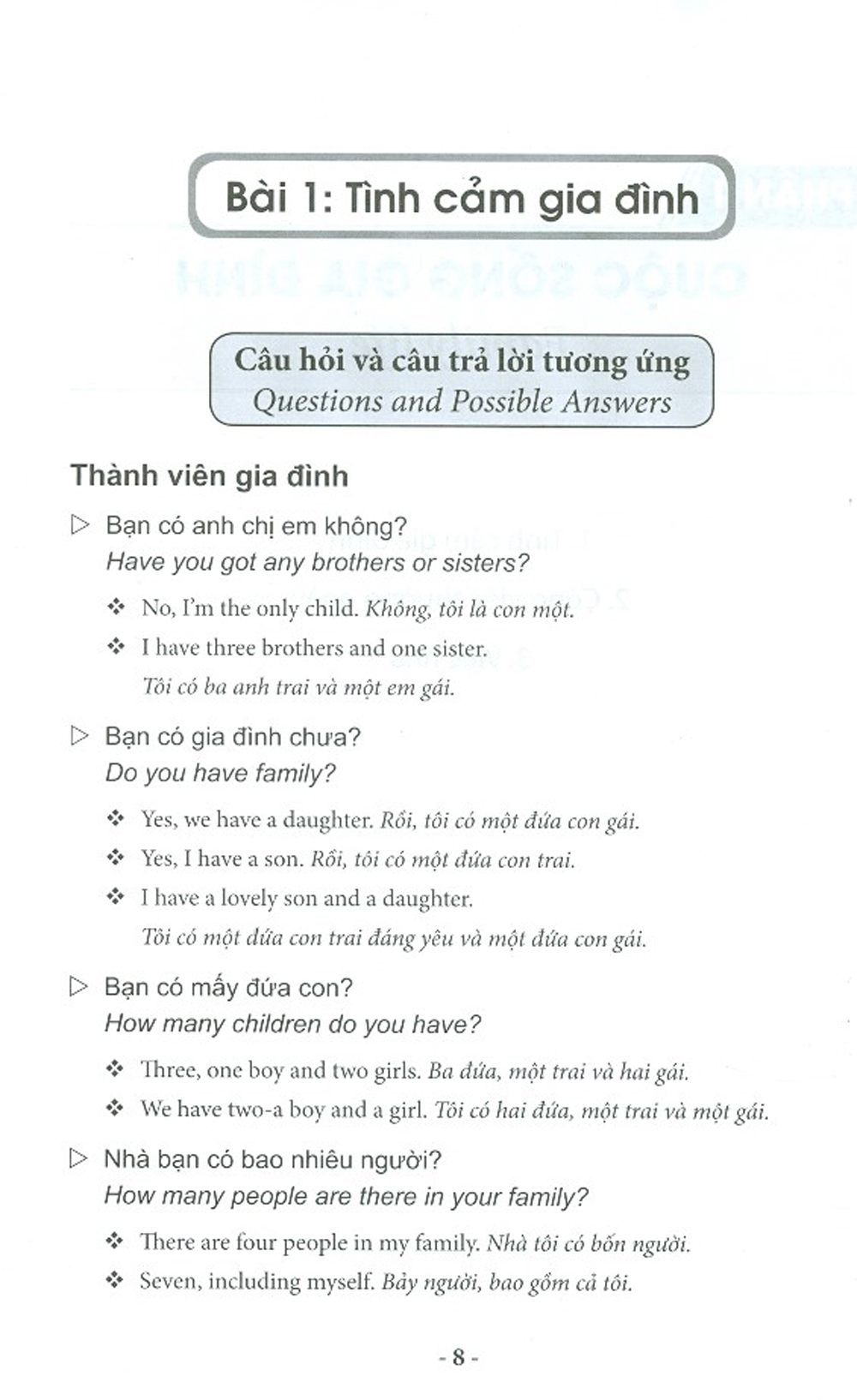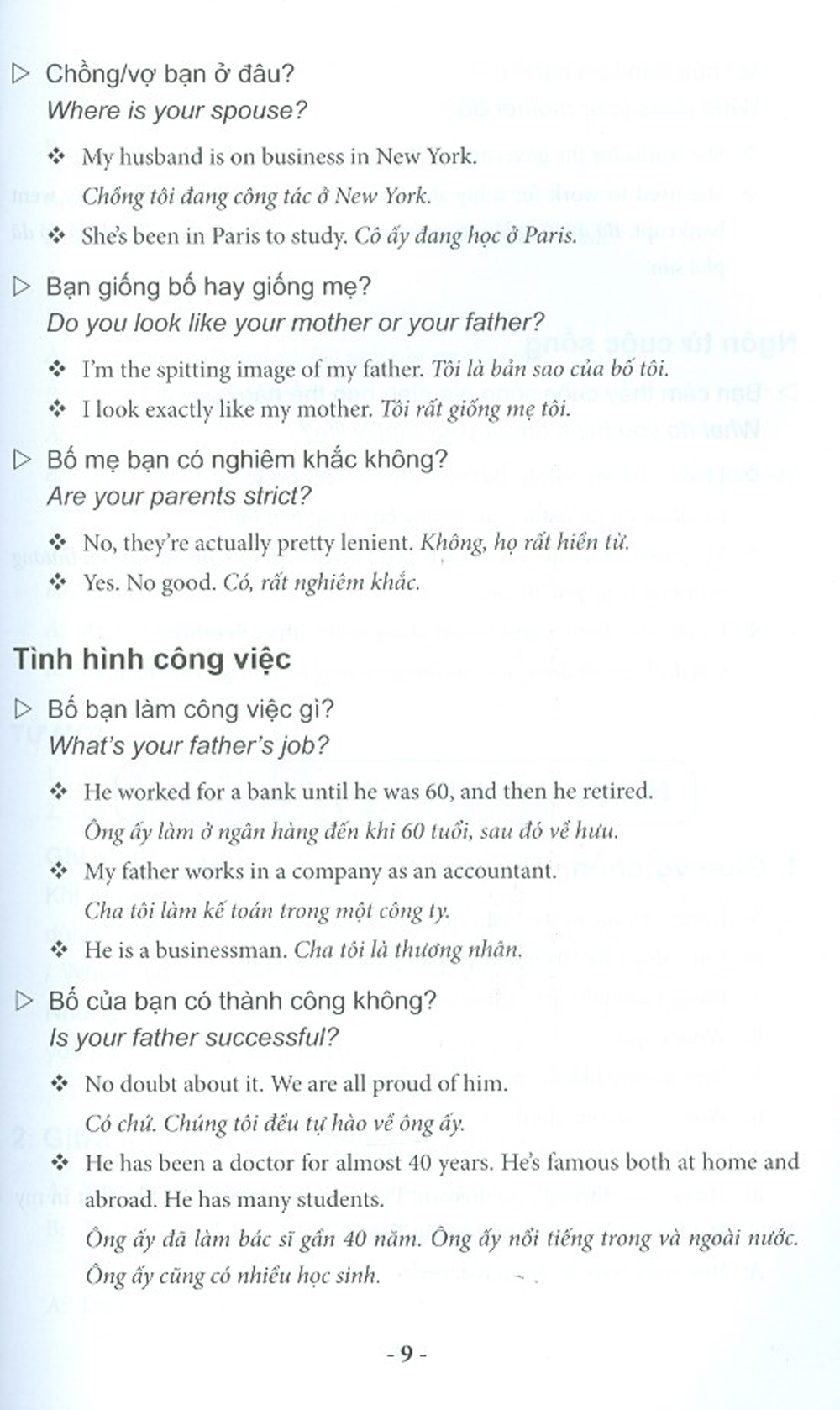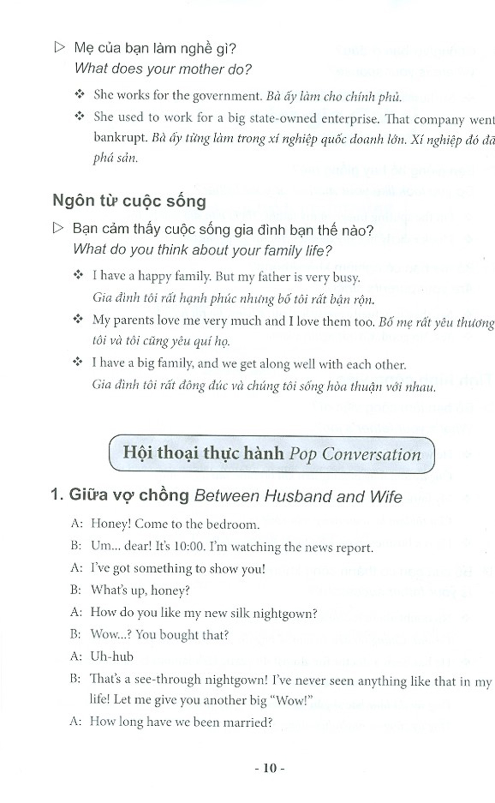 Bộ sách này sẽ là tài liệu hữu ích cho bạn. Bộ sách gồm 2 tập. Tập 1 bao gồm các chủ đề đàm thoại về cuộc sống gia đình, tình yêu và hôn nhân, giao tiếp xã hội, và cuộc sống sinh hoạt hằng ngày. Các chủ đề đàm thoại ở Tập 2 đi sâu vào các lĩnh vực như giao thông, dịch vụ khách sạn, học tập và giải trí, thể thao, du lịch, nghề nghiệp, và thương mại.