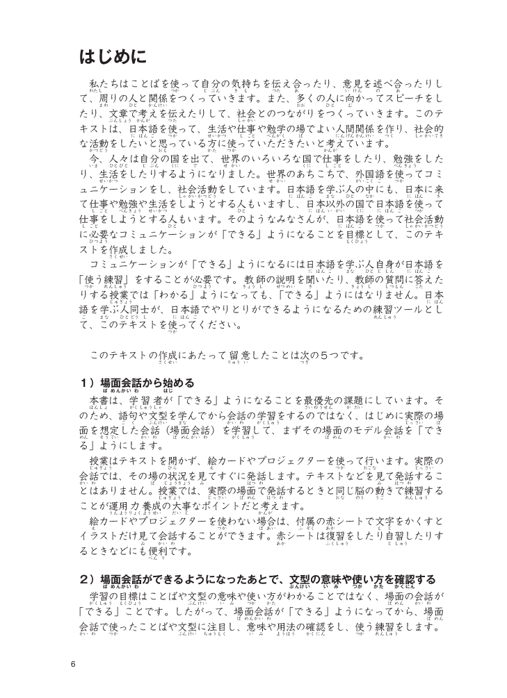 Giáo trình được biên soạn nhằm giúp người học giao tiếp bằng tiếng Nhật tốt hơn trong các hoạt động xã hội. Các tình huống học tập trong giáo trình là những tình huống thường được sử dụng để giao tiếp trên thực tế, được lựa chọn từ các lĩnh vực trong đời sống sinh hoạt, trường học và xã hội. Cách học được tổ chức theo hình thức đặc biệt ưu tiên việc "Giao tiếp" hơn là "Hiểu" từ vựng và ngữ pháp. [Hội thoại tình huống -> Xác nhận mẫu câu -> Luyện tập mẫu câu -> Hội thoại ứng dụng] Giáo trình bao gồm 2 sách giáo khoa sơ cấp 1, 2, hai quyển Work book sơ cấp 1,2 và 1 quyển Bản dịch và giải thích ngữ pháp.