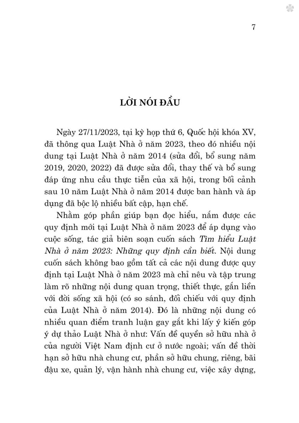 Mua tại TiktokNhằm kịp thời phục vụ nhu cầu của bạn đọc, Nhà xuất bản Chính trị quốc gia Sự thật xuất bản cuốn sách Tìm hiểu Luật Nhà ở năm 2023: Những quy định cần biết do Luật sư Trương Ngọc Liêu biên soạn. Cuốn sách gồm 07 chương: Chương I: Những nội dung cơ bản. Chương II: Quyền sở hữu nhà ở tại Việt Nam của tổ chức, cá nhân nước ngoài. Chương III: Phát triển nhà ở. Chương IV: Chính sách về nhà ở xã hội. Chương V: Cải tạo, xây dựng lại nhà chung cư. Chương VI: Quản lý, sử dụng nhà chung cư. Chương VII: Giao dịch về nhà ở. Xin trân trọng giới thiệu cuốn sách và mong nhận được ý kiến góp ý của bạn đọc.