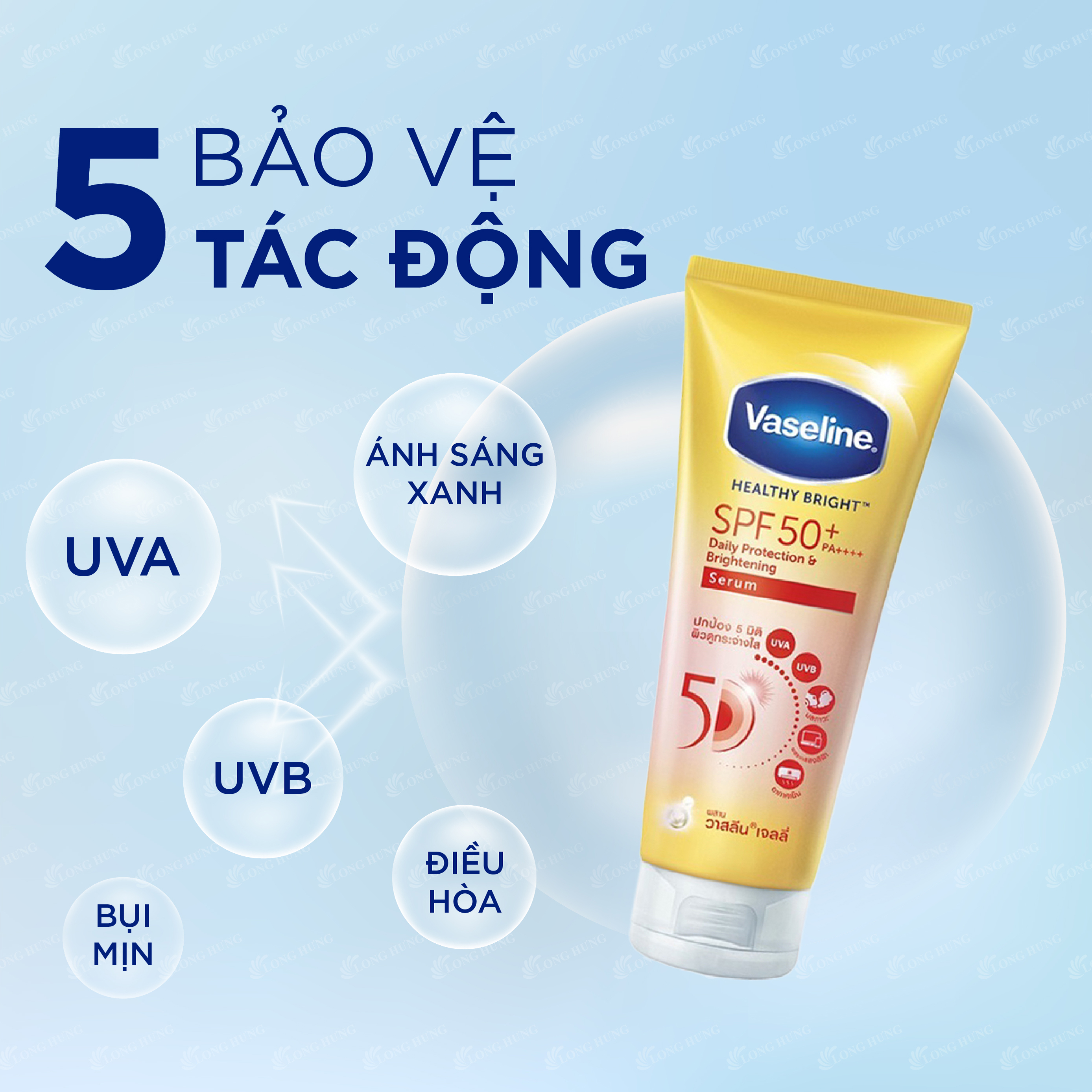 Tinh chất dưỡng thể chống nắng Vaseline Healthy Bright SPF 50+ PA++++ Thành phần: + SPF 50+ PA++++: giúp bảo vệ da chống lại tác hại của tia UVA/UVB lên đến 98%. + 10x Niacinamide