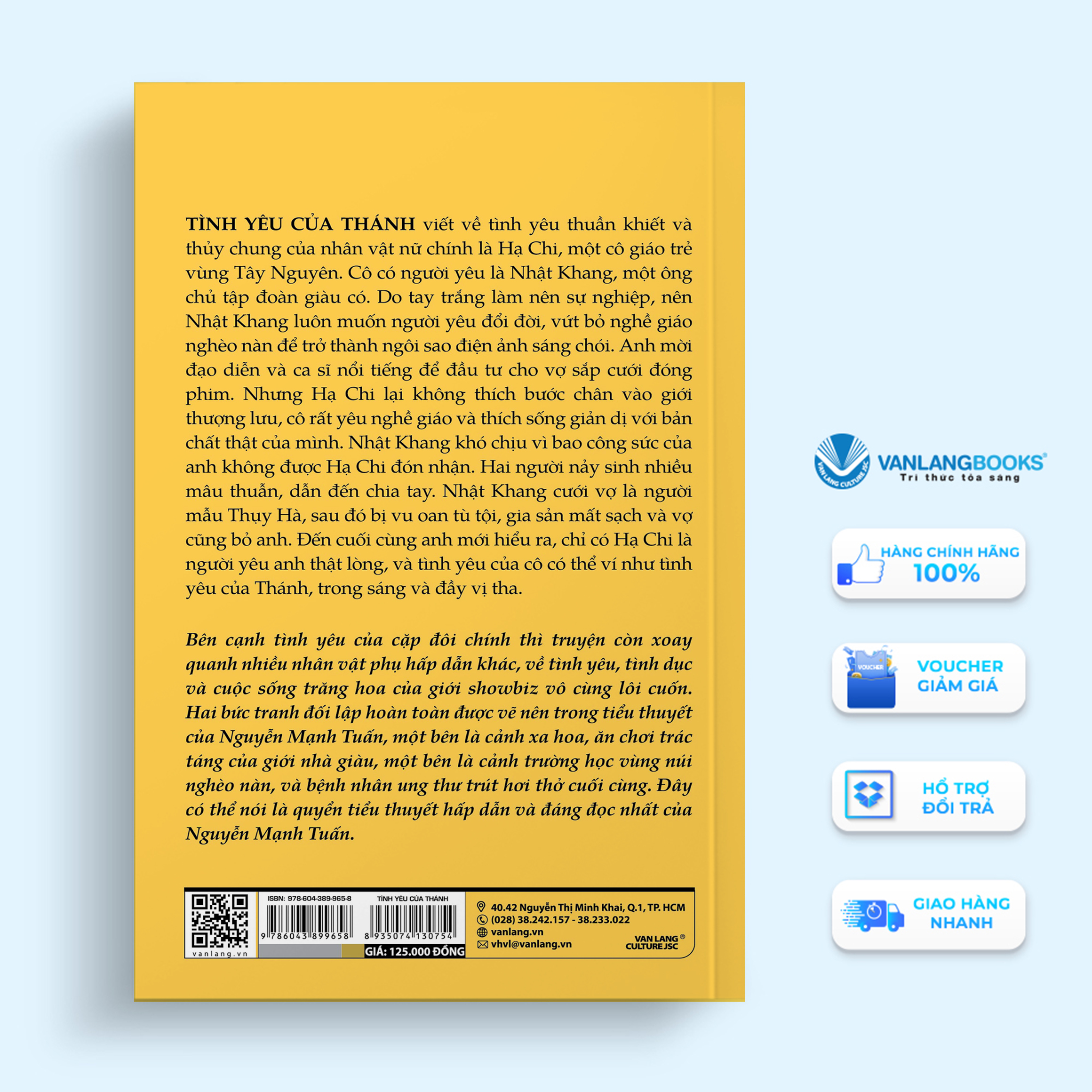Tình Yêu Của Thánh-Vanlangbooks I.Giới thiệu sách Tình yêu của Thánh viết về tình yêu thuần khiết và thủy chung của nhân vật nữ chính là Hạ Chi, một cô giáo trẻ vùng Tây Nguyên. Cô có người yêu là Nhật Khang, một ông chủ tập đoàn giàu có. Do tay trắng làm nên sự nghiệp, nên Nhật Khang luôn muốn người yêu đổi đời, vứt bỏ nghề giáo nghèo nàn để trở thành ngôi sao điện ảnh sáng chói. Anh mời đạo diễn và ca sĩ nổi tiếng để đầu tư cho vợ sắp cưới đóng phim. Nhưng Hạ Chi lại không thích bước chân vào giới thượng lưu, cô rất yêu nghề giáo và thích sống giản dị với bản chất thật của mình. Nhật Khang khó chịu vì bao công sức của anh không được Hạ Chi đón nhận. Hai người nảy sinh nhiều mâu thuẫn, dẫn đến chia tay. Nhật Khang cưới vợ là người mẫu Thụy Hà, sau đó bị vu oan tù tội, gia sản mất sạch và vợ cũng bỏ anh. Đến cuối cùng anh mới hiểu ra, chỉ có Hạ Chi là người yêu anh thật lòng, và tình yêu của cô có thể ví như tình yêu của Thánh, trong sáng và đầy vị tha. Bên cạnh tình yêu của cặp đôi chính thì truyện còn xoay quanh nhiều nhân vật phụ hấp dẫn khác, về tình yêu, tình dục và cuộc sống trăng hoa của giới showbiz vô cùng lôi cuốn. Hai bức tranh đối lập hoàn toàn được vẽ nên trong tiểu thuyết của Nguyễn Mạnh Tuấn, một bên là cảnh xa hoa, ăn chơi trác táng của giới nhà giàu, một bên là cảnh trường học vùng núi nghèo nàn, và bệnh nhân ung thư trút hơi thở cuối cùng. Đây có thể nói là quyển tiểu thuyết hấp dẫn và đáng đọc nhất của Nguyễn Mạnh Tuấn. II.Thông tin chi tiết Mã hàng      8935074130754 Tên Nhà Cung Cấp        Cty Văn Hóa Văn Lang Tác giả        Nguyễn Mạnh Tuấn NXB Hồng Đức Năm XB     2023 Ngôn Ngữ   Tiếng Việt Trọng lượng (gr)   355 Kích Thước Bao Bì        20.5 x 13.5 x 1.5 cm Số trang      328 Hình thức    Bìa Mềm