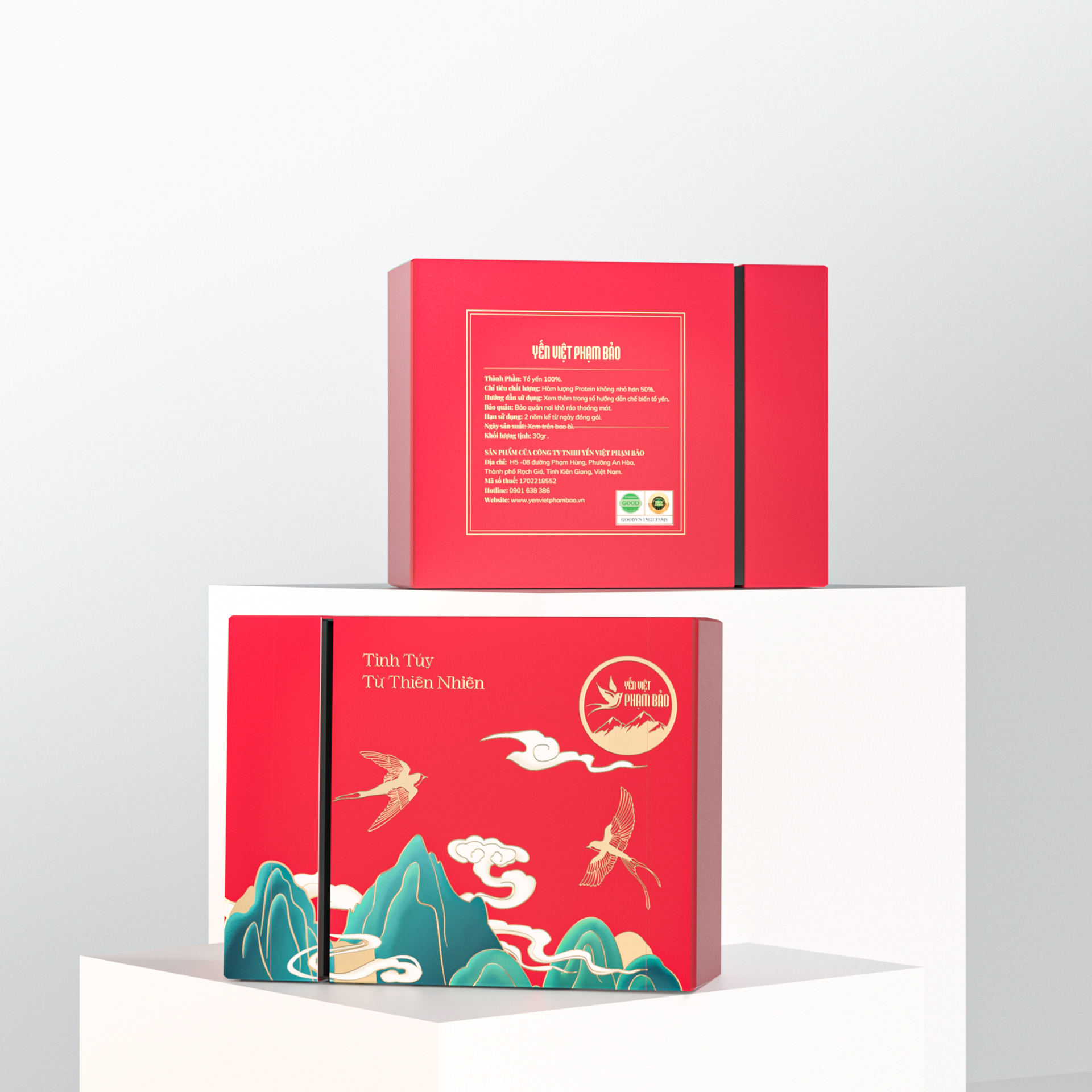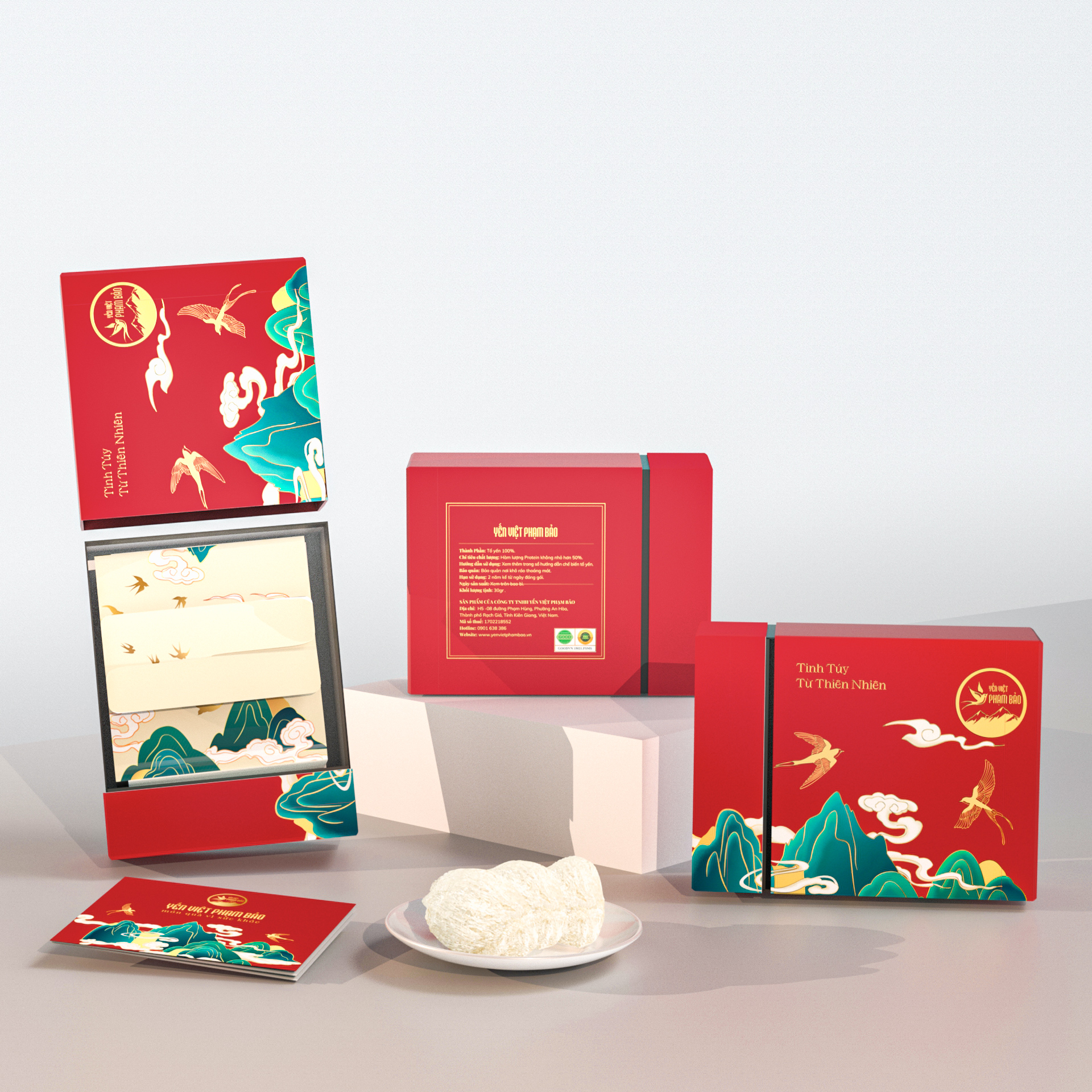 Hộp giấy chữ nhật kích thước 23x28x6 (cm) Gồm 2 hộp, mỗi hộp gồm 60 phần yến, mỗi phần 1,5 g + 60 gói đường phèn, mỗi gói 7 g 100% yến nguyên chất, KHÔNG