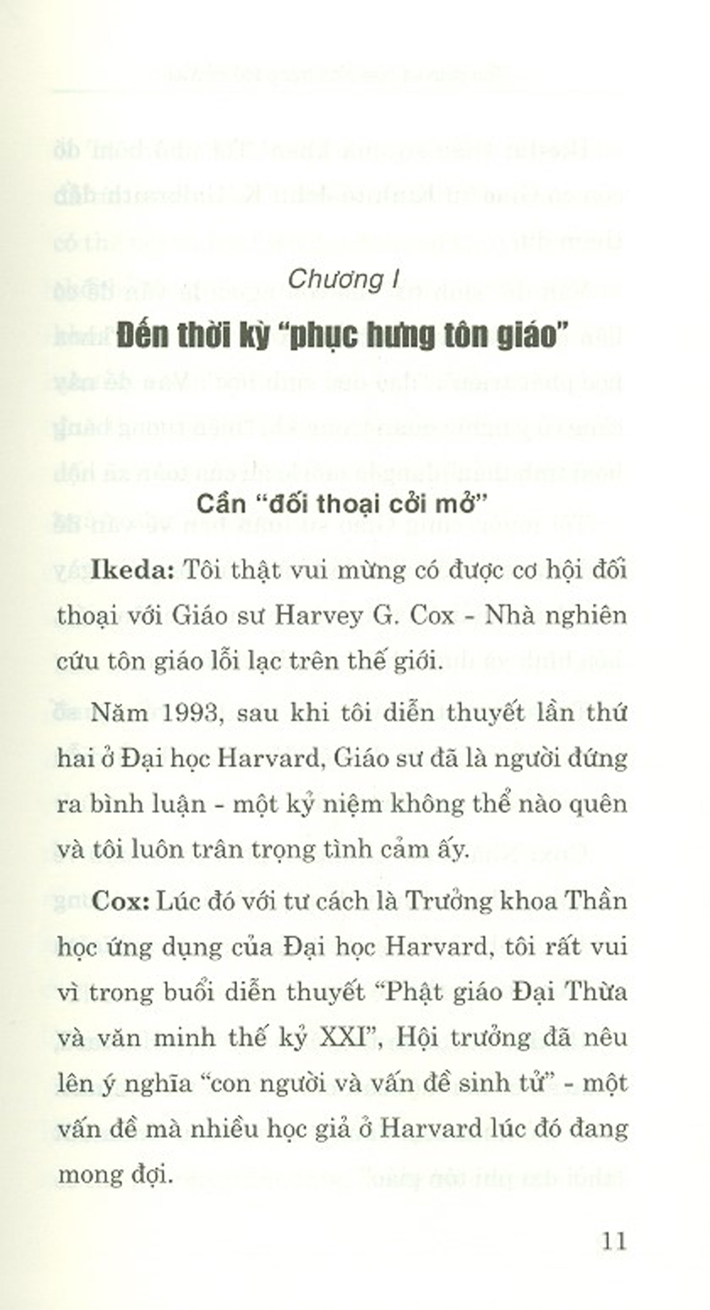 Nội dung cuốn sách được trình bày dưới hình thức một cuộc đối thoại cởi mở và đầy trách nhiệm giữa Tiến sĩ tôn giáo học Harvey G.Cox – chuyên gia nghiên cứu hàng đầu người Mỹ về vấn đề tôn giáo – văn hóa – chính trị và Tiến sĩ Ikeda Daisaku – học giả uyên bác về nhiều lĩnh vực khoa học, nhà văn hóa nổi tiếng ở Nhật Bản cũng như trên thế giới.
