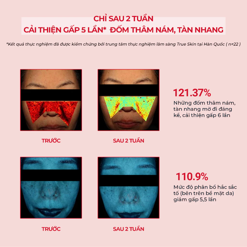 Hiệu quả sử dụng sau 2 tuần đã được kiểm nghiệm bởi Trung tâm thử nghiệm lâm sàng tại Hàn Quốc.Tối ưu hiệu quả cho các làn da đang bị thâm đỏ, sạm nám, da không đều màu, có đốm nâu, ...