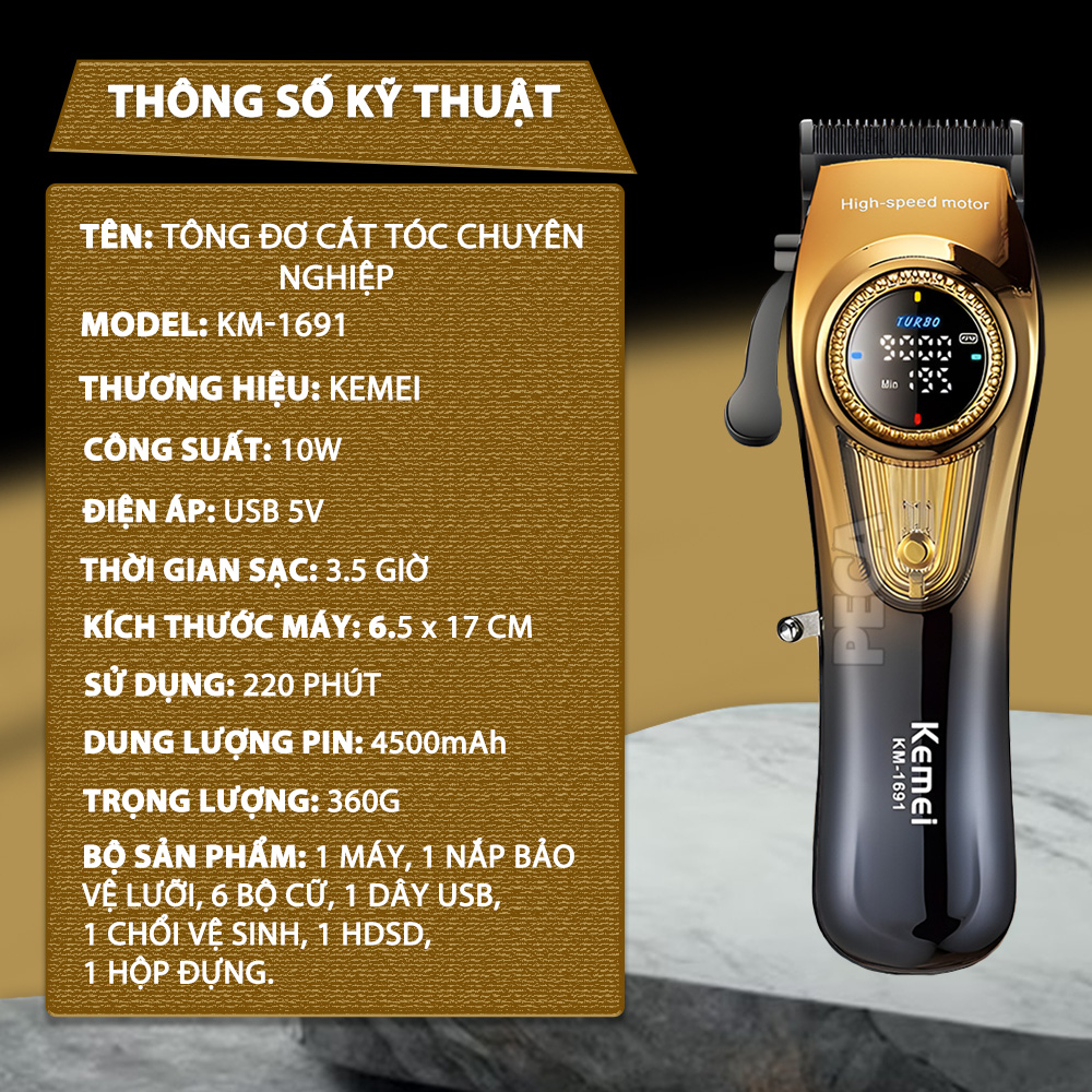 TÔNG ĐƠ CẮT TÓC CHUYÊN NGHIỆP KEMEI KM-1691 CÔNG SUẤT MẠNH 10W, MÀN HÌNH LCD HIỂN THỊ SẠC, LƯỠI CẮT MẠ CARBON DLC CAO CẤP