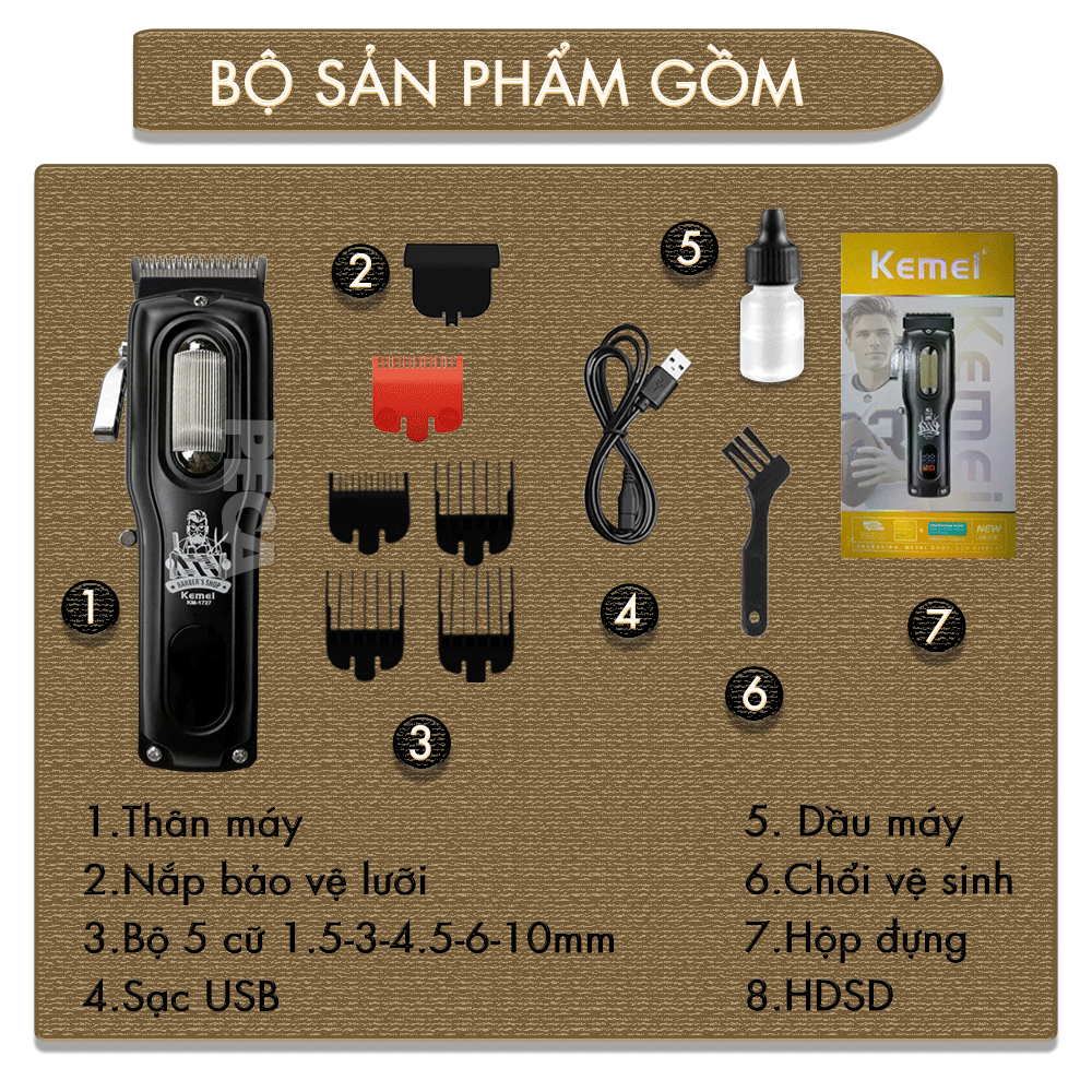 Hoạt động êm ái: Mặc dù động cơ mạnh mẽ, máy vẫn hoạt động rất êm ái, không gây ra tiếng ồn lớn, tạo sự thoải mái cho người sử dụng cũng như khách hàng trong môi trường chuyên nghiệp. Kemei KM-1727 có tốc độ cắt mạnh mẽ. Tốc độ này lý tưởng để đảm bảo khả năng cắt nhanh chóng và hiệu quả, giúp tiết kiệm thời gian cho người sử dụng. 4/ Dung lượng pin Kemei KM-1727 sử dụng pin Lithium-ion, loại pin nổi tiếng với khả năng lưu trữ năng lượng hiệu quả và tuổi thọ cao. Dung lượng cao 2000 mAh, giúp máy có thể hoạt động liên tục trong một khoảng thời gian dài mà không cần sạc lại thường xuyên. Thời gian sạc chỉ 3 giờ cho thời gian sử dụng lên đến 240 phút. Thời gian sạc tương đối này là nhờ vào công nghệ sạc nhanh, giúp tiết kiệm thời gian và tăng tính tiện lợi cho người dùng. Tông đơ Kemei KM-1727 được thiết kế với cổng sạc USB, mang lại sự linh hoạt tối đa cho người dùng. Máy được tặng kèm theo 1 dây sạc USB đa dạng phương pháp sạc có thể sử dụng cùng điện thoại, máy tính, xe hơi, sạc dự phòng,... 5/ Màn hình LED hiển thị thông minh Tăng đơ cắt tóc Kemei KM-1727 được trang bị màn hình LED hiện đại, cung cấp thông tin cần thiết cho người dùng và tăng cường trải nghiệm sử dụng: Hiển thị trạng thái % pin tiện lợi Bộ sản phẩm bao gồm: Thân máy, Nắp bảo vệ lưỡi, Bộ 5 cữ: 1.5-3-4.5-6-7.5mm, Dây sạc USB, Chổi vệ sinh, Dầu máy, HDSD, Hộp đựng HƯỚNG DẪN SỬ DỤNG: