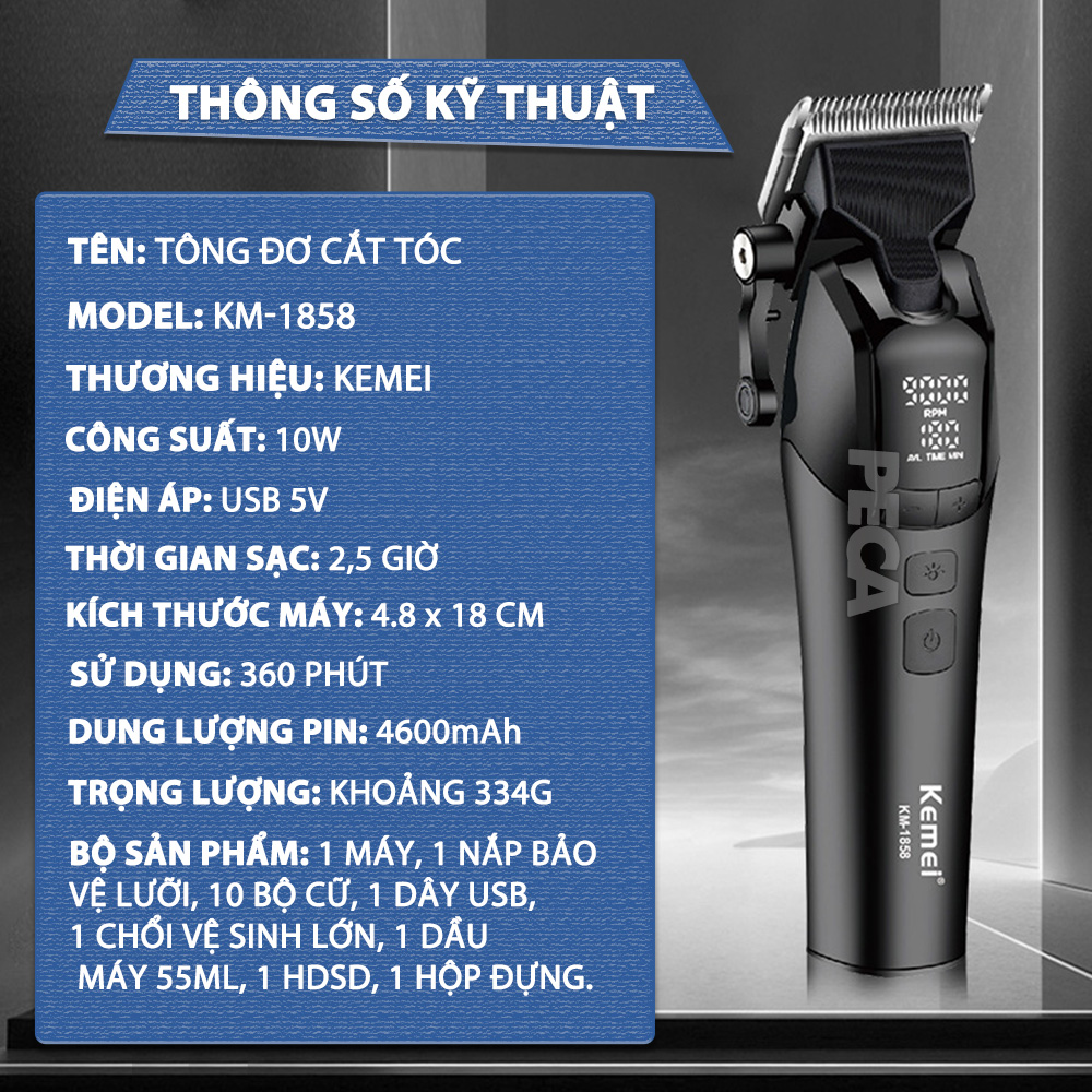 TÔNG ĐƠ CẮT TÓC CHUYÊN NGHIỆP KEMEI KM-1858 CÔNG SUẤT MẠNH 10W, MÀN HÌNH LCD HIỂN THỊ, LƯỠI CẮT MẠ CARBON DLC CAO CẤP