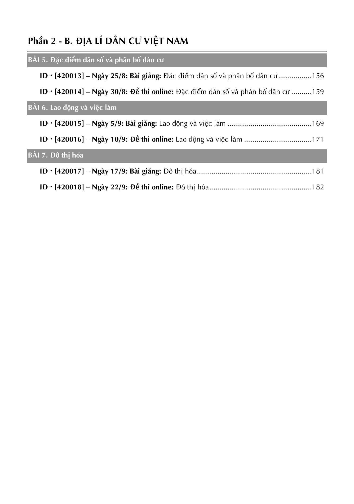 - Tập 1: Số liệu - Biểu đồ , địa lí tự nhiên địa lí dân cư Việt Nam Theo dạng thức đề thi mới , đối với môn địa lí, kỹ năng xử lý số liệu và biểu đồ chiếm tỉ lệ rất lớn, việc nắm vững các công thức xử lý số liệu sẽ giúp học sinh giải quyết tốt các câu hỏi Đúng/sai và trả lời ngắn trong đề bài. So với dạng thức cũ, những câu hỏi liên quan đến phần này chiếm số lượng nhiều hơn hẳn và độ khó cũng được tăng lên do đó việc ôn tập các công thức này một cách tổng hợp là điều rất quan trọng.