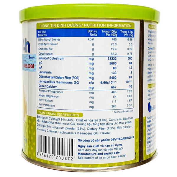 - Sữa non 24h đầu duy nhất trên thị trường • ColosIgG 24h được nhập khẩu độc quyền từ Mỹ bởi công ty VitaDairy Việt Nam. • Sản phẩm ColosIgG 24h là sữa non được thu chỉ trong vòng 24h đầu tiên sau sinh của bò, cung cấp hàm lượng kháng thể IgG tự nhiên cao nhất, giúp duy trì tác dụng tăng cường miễn dịch tốt nhất.