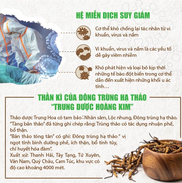Thành phần: Chiết xuất đông trùng hạ thảo chiếm 70%, chiết xuất hỗn hợp thảo dược (gồm quế, nấm linh chi, gừng,…) 26%, đường oligosaccharide, màu caramel, chiết xuất hạt bưởi Hướng dẫn sử dụng: