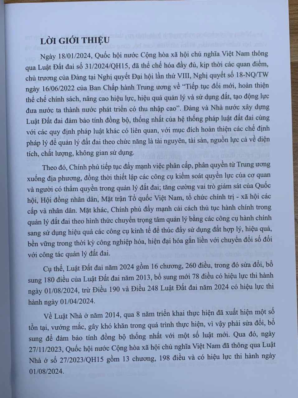Ngày 18/01/2024, Quốc hội nước Cộng hòa xã hội chủ nghĩa Việt Nam thông qua Luật Đất đai số 31/2024/QH15, đã thể chế hóa đầy đủ, kịp thời các quan điểm, chủ trương của Đảng