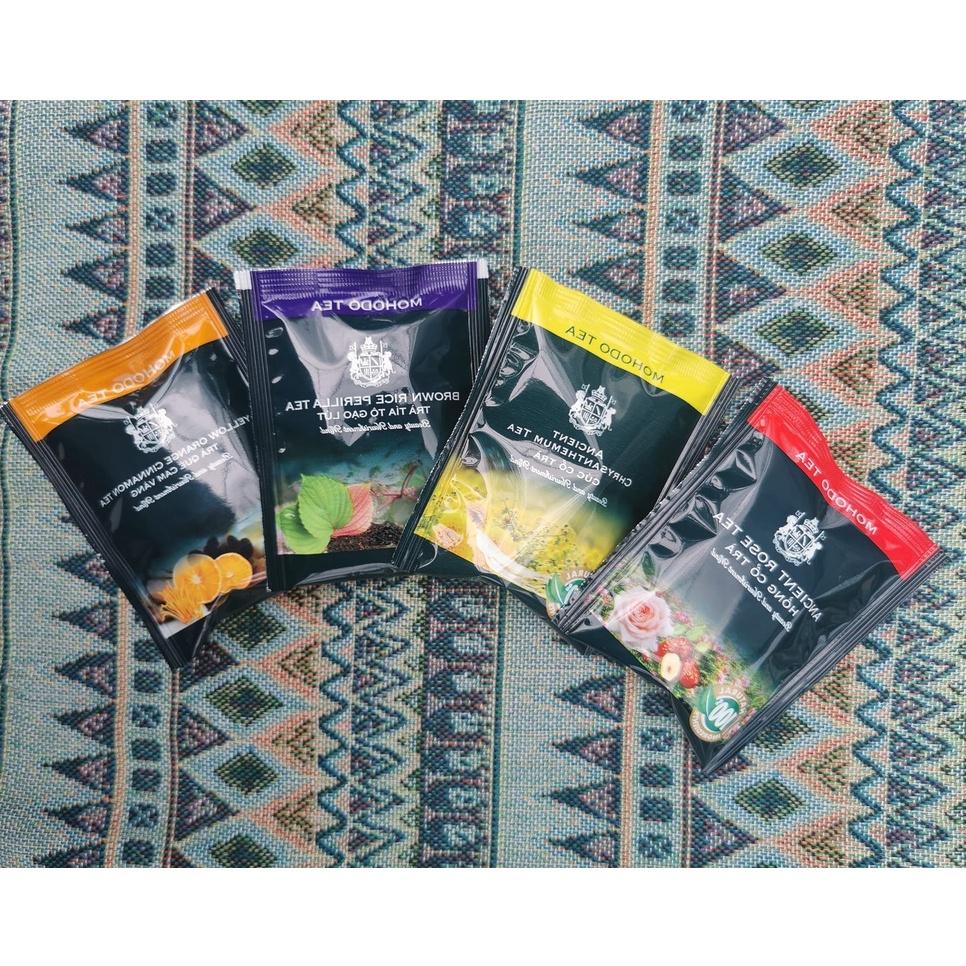 - Thành phần: Gồm 4 vị trà hoa: Trà Hồng Cổ, Trà Cúc Cổ, Trà Cam Quế Đông Trùng và Trà Tía Tô Gạo lứt Đậu đen