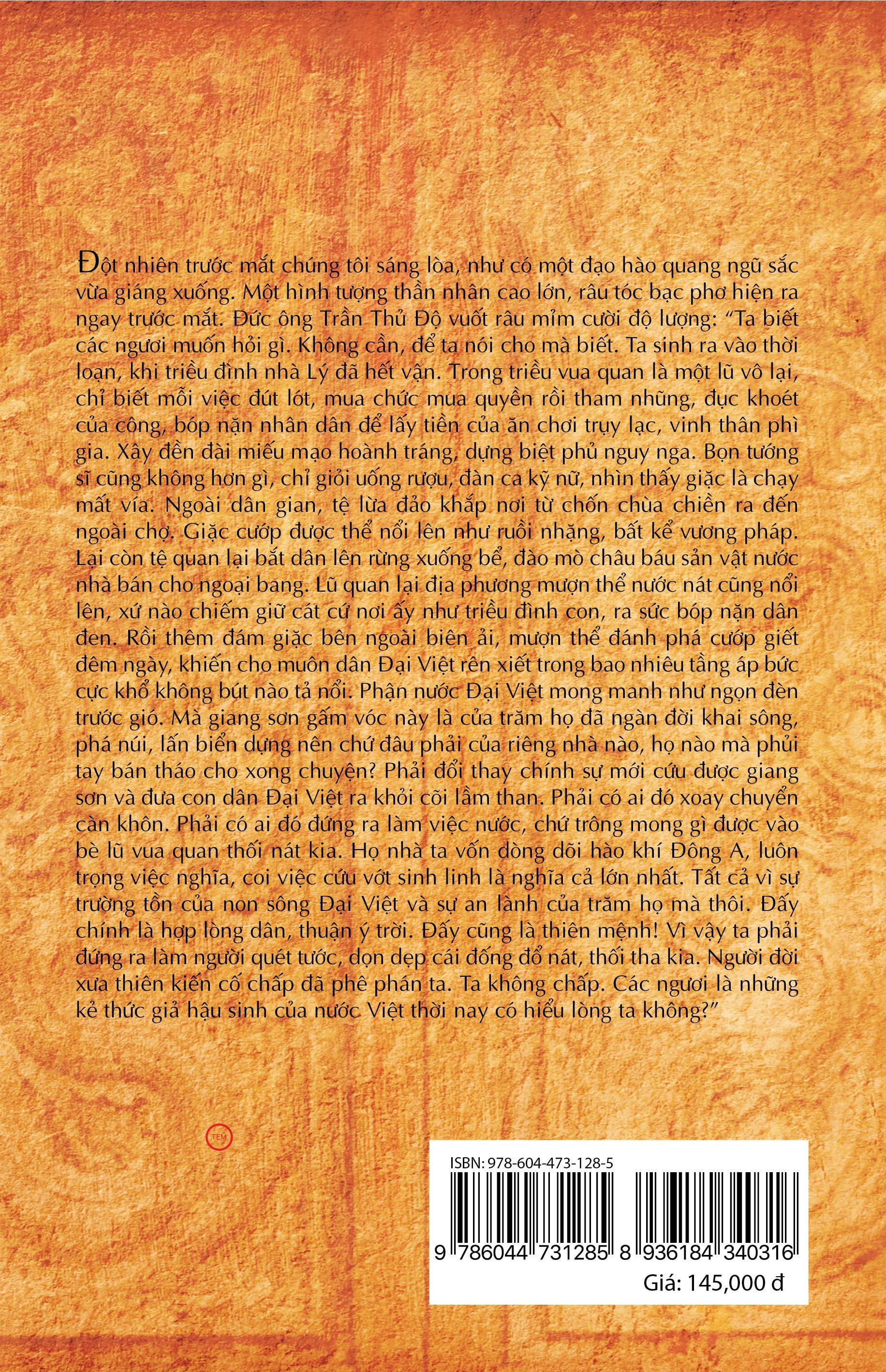 Trần Thủ Độ là “kiến trúc sư” của cuộc chuyển giao quyền lực êm ái giữa vương triều Lý và vương triều Trần. Một cuộc chuyển giao không có binh đao, máu chảy nhưng không hề đơn giản với nhiều mưu chước và kéo dài trong mấy chục năm từ thời điểm Trần Lý hoạch định chiến lược đến thời điểm Trần Cảnh lên ngôi hoàn thành đại nghiệp gia tộc họ Trần. Tất cả sẽ được thể hiện sinh động, đầy màu sắc trong tiểu thuyết lịch sử “Trần Thủ Độ” của tác giả Trần Thanh Cảnh.