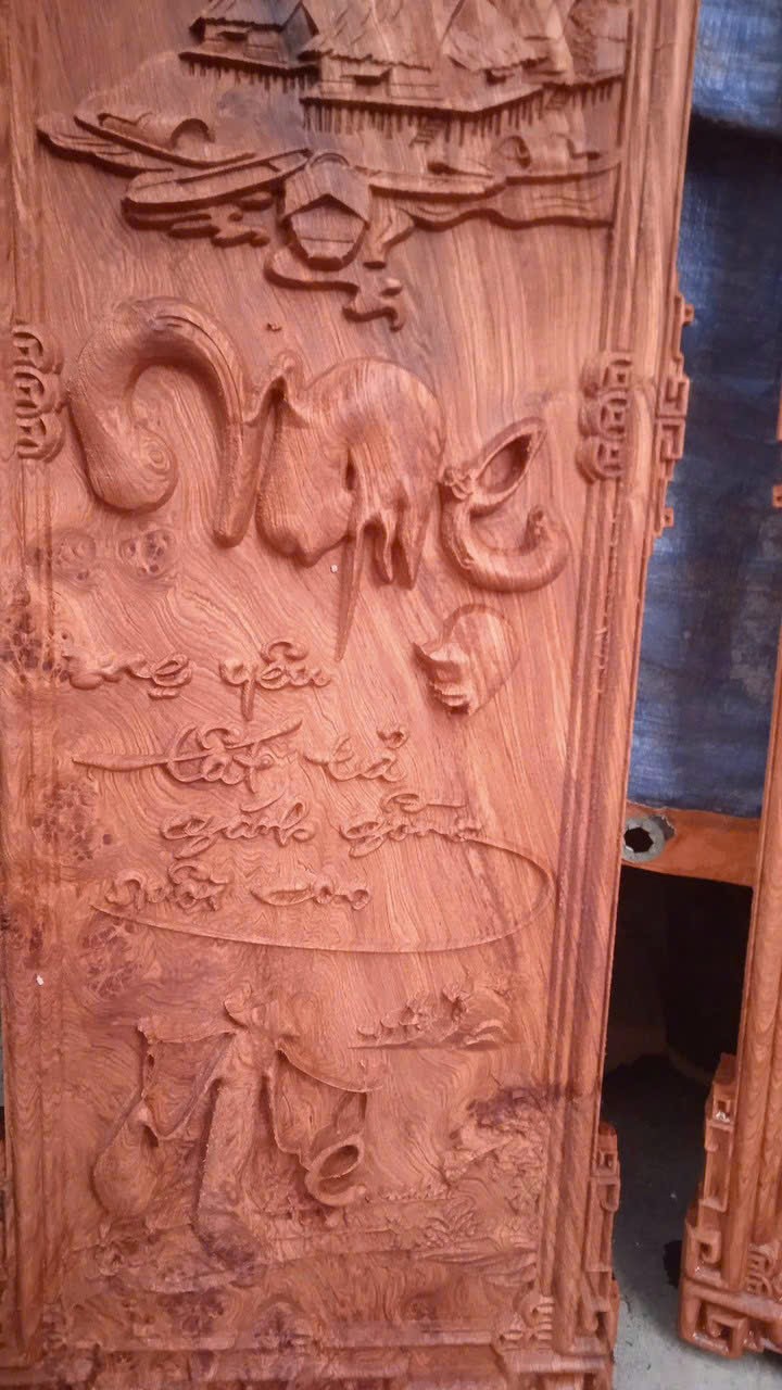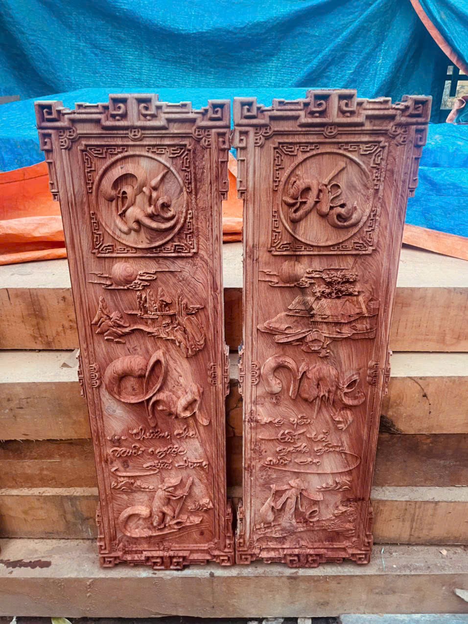 _ Cặp trang được khắc nổi tỉ mỉ ,tinh xảo kỳ công .Đi hầu hết tất cả mọi chi tiết góc ngách nội dung hoa văn của cặp tranh đều được gọt tỉa chỉnh sửa sắc nét hoàn toàn bằng tay thủ công .Đồng thời tranh được kiểm định kỹ lưỡng khắt khe ,như cho vào thẩm sấy cho gỗ khô kiệt .Mục đích chống dập nứt vênh mo mối mọt .Kết hợp với trà nhám đánh giấy giáp nhiều nước sờ mát lạnh .Song cho vào phun lót làm bóng mờ để giữ lại mầu sắc vân gỗ tự nhiên .Đẹp long lanh như ảnh trên .Câu đối được làm và hoàn thiện do bàn tay khối óc tài hoa .Từ những người thợ giàu kinh nghiệm cũng như tay nghề cao trong làng nghề truyền thống