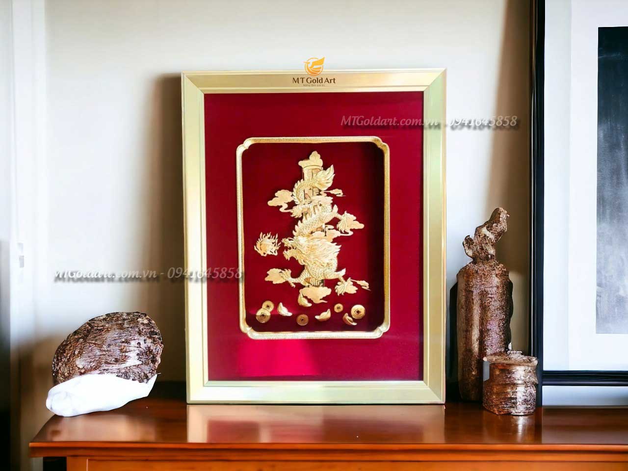 Rồng được coi là con vật linh thiêng, đại diện cho quyền uy, sức mạnh và thịnh vượng. Ngoài ra, Rồng còn biểu tượng của phái nam. Treo bức tranh dát vàng Rồng vờn ngọc