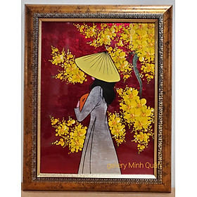 Thiếu nữ áo dài” Tranh sơn mài” Chất liệu: Sơn mài đắp nổi thếp vàng, bạc Khung tranh composite cao cấp Kích thước phủ khung 38cm*48cm