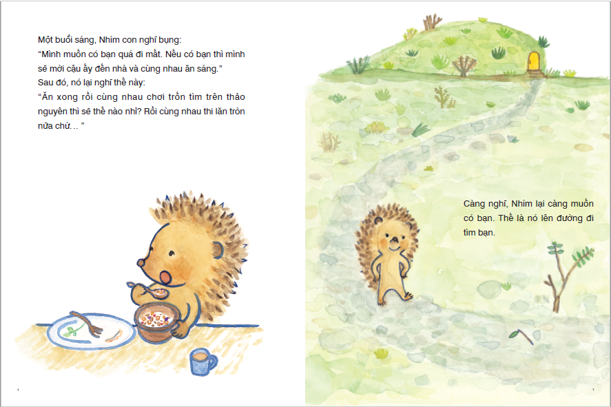 Có một chú Nhím sống một mình trong một cái hang ở tận cùng của thảo nguyên. Một buổi sáng Nhím con muốn đi tìm bạn để cùng được ăn sáng và chơi trốn tìm. Thế là bạn Nhím con quyết định lên đường đi tìm bạn