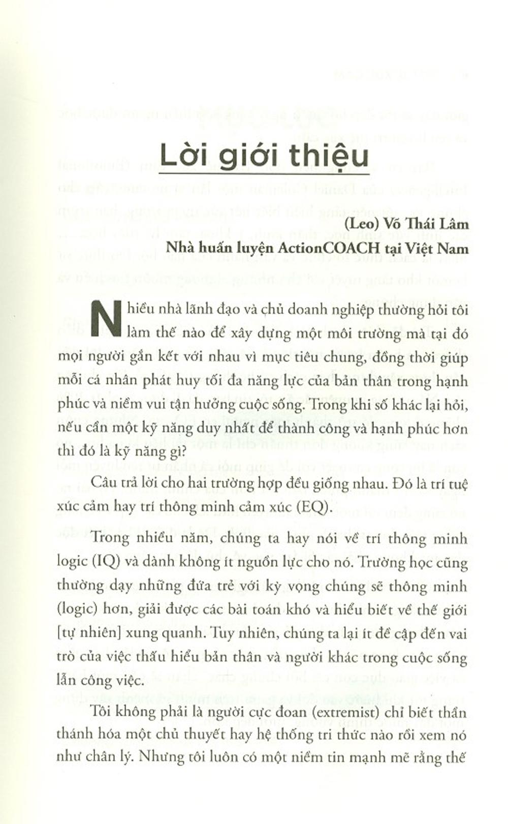 Ai cũng biết điểm IQ cao chưa chắc đã đảm bảo cho một cuộc đời thành công, hạnh phúc và đức hạnh. Nhưng chỉ đến khi đọc Trí Tuệ Xúc Cảm (Emotional Intelligence) của Daniel Goleman, chúng ta mới có thể lý giải tại sao. Dựa trên những quan sát và nghiên cứu nhiều năm trong lĩnh vực tâm lý và khoa học thần kinh, tác giả đã mang đến một cái nhìn mới mẻ về hai loại trí tuệ bên trong mỗi con người - lý trí và cảm xúc - cùng cách mà chúng định hình số phận của chúng ta.