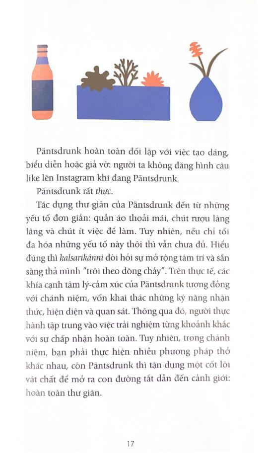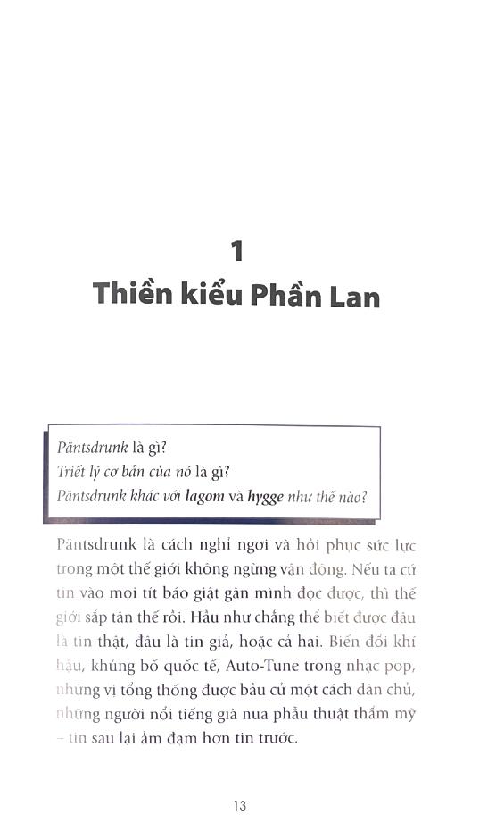 Mua tại TiktokTriết Lý Sống Pantsdrunk - Chill Như Người Phần Lan Sau một tuần làm việc vất vả, hãy thoải mái dẹp hết mọi kế hoạch – và vứt luôn quần áo – rồi đóng cửa, ngồi trong nhà, bật Netflix lên và… uống đi.” - Tờ Washington Post Nói đến mức độ hạnh phúc, Phần Lan luôn đứng top thế giới. Nhiều khía cạnh đời sống ở Phần Lan là chuẩn mực ao ước của nhiều quốc gia: Hệ thống giáo dục tốt nhất, bình đẳng về giới tính, phúc lợi cao và triết lý sisu. Ẩn sau những thành tựu này chính là khả năng duy trì sự điềm tĩnh, khỏe mạnh và hài lòng giữa những cơn sóng công việc cuồn cuộn của người Phần Lan. Và khả năng này là kết quả của việc thực hành kalsarikänni, hay triết lý sống Päntsdrunk. Trong bộ đồ ngủ Mình ta với ta Tự do tự tại Uống cho quên đời