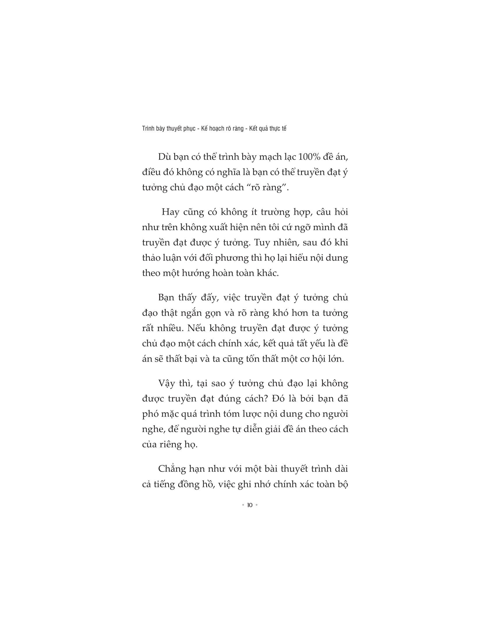 Chìa khóa cho vấn đề nằm ở việc nắm vững tư duy cũng như kỹ thuật để xây dựng ý tưởng chủ đạo, tạo ra các giá trị tiềm năng cho người nghe, đồng thời truyền tải chúng một cách ngắn gọn nhưng hiệu quả. Khi trình bày thuyết phục rành mạch, với kế hoạch rõ ràng xác đáng cùng kết quả thực tế khả thi, chắc chắn đề xuất của bạn sẽ dẽ dàng “chạm đích”. Cuốn sách với sáu chương ngắn gọn tập trung vào một kỹ thuật được gọi là «Thuyết trình đơn giản », một kỹ thuật cân bằng giữa việc tạo ra giá trị hấp dẫn và việc trình bày nó một cách rõ ràng dễ hiểu.