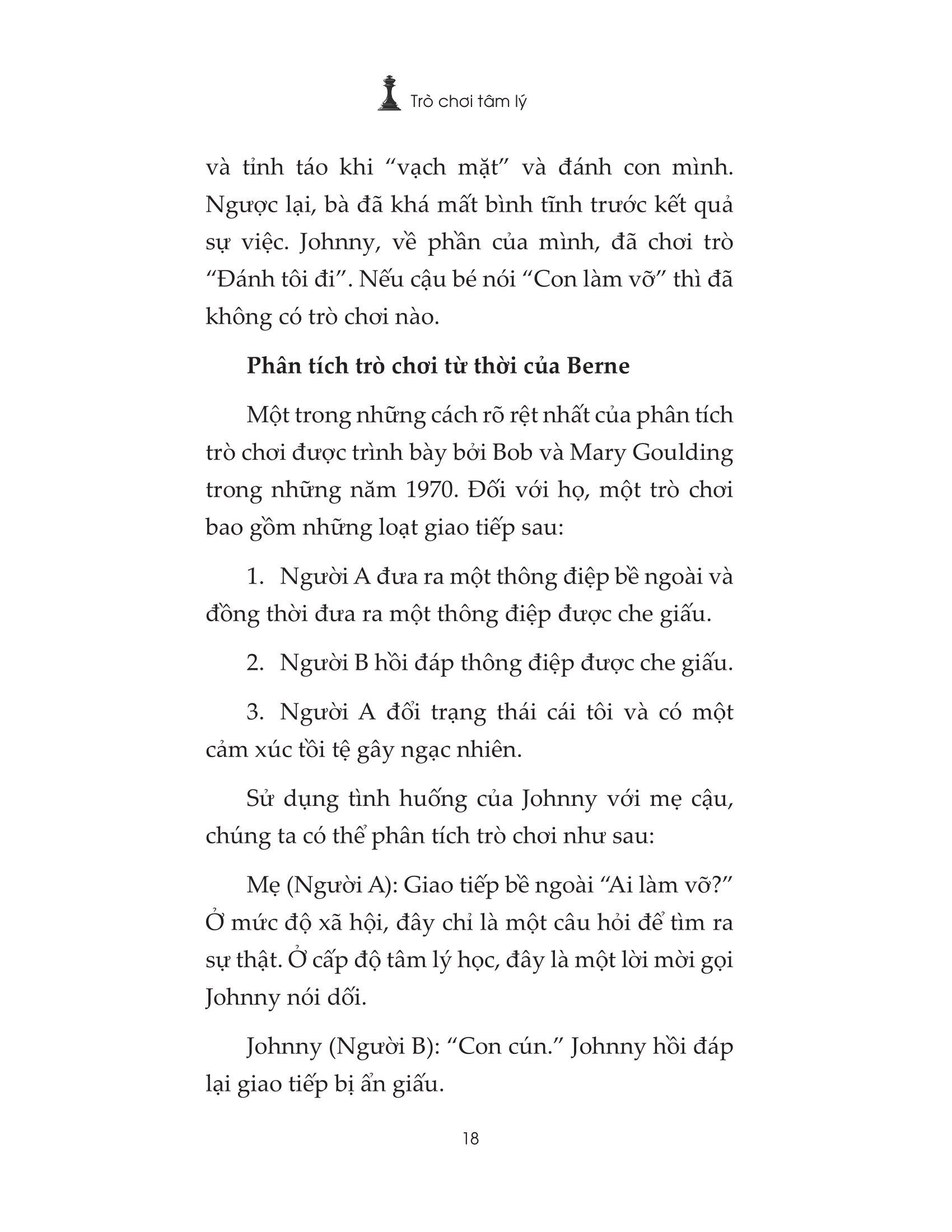 “Trò chơi tâm lý” là một cuốn sách kinh điển về hành vi của con người, giải thích những trò chơi tâm lý hoang dã và thú vị mà bạn và mọi người xung quanh bạn chơi để thao túng lẫn nhau đồng thời cũng đưa ra các cách chế ngự bản ngã của m.ình để bạn có thể ngừng chơi với những mối quan hệ độc hại và tận hưởng những mối quan hệ lành mạnh hơn.