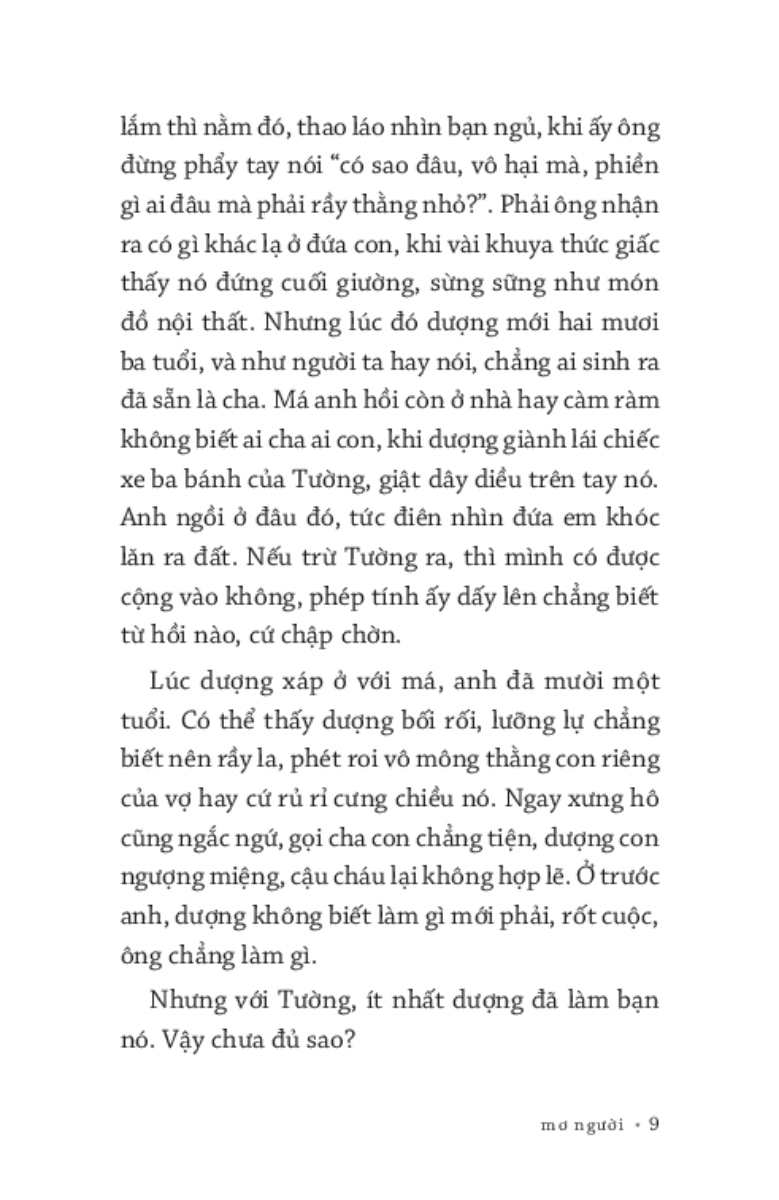 “Em thà trôi một mình. Nhưng những gì còn sót lại của một cù lao phân rã chẳng là bao. Vài ba mái nhà lấp ló trên mặt nước, một vài cái , những rẻo đất đủ rộng cho một người ngồi thì cũng có, lại trôi đờ đẫn đằng xa. Mãi mới có mảnh đất trôi gần, đúng lúc nó rùng mình nứt làm hai.