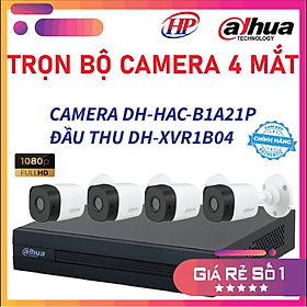 Trọn bộ sản phẩm 4 mắt camera DH-HAC-B1A21P. Hãng DAHUA full 1080p bao gồm: 1 Đầu thu 4 cổng DH-XVR1B04 4 Camera ngoài trời chống nước thân nhựa cao cấp chuẩn