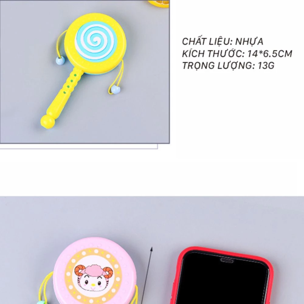 Màu sắc trống lục lạc cho bé: Nhiều màu đẹp, sặc sỡ, kiểu dáng bắt mắt.