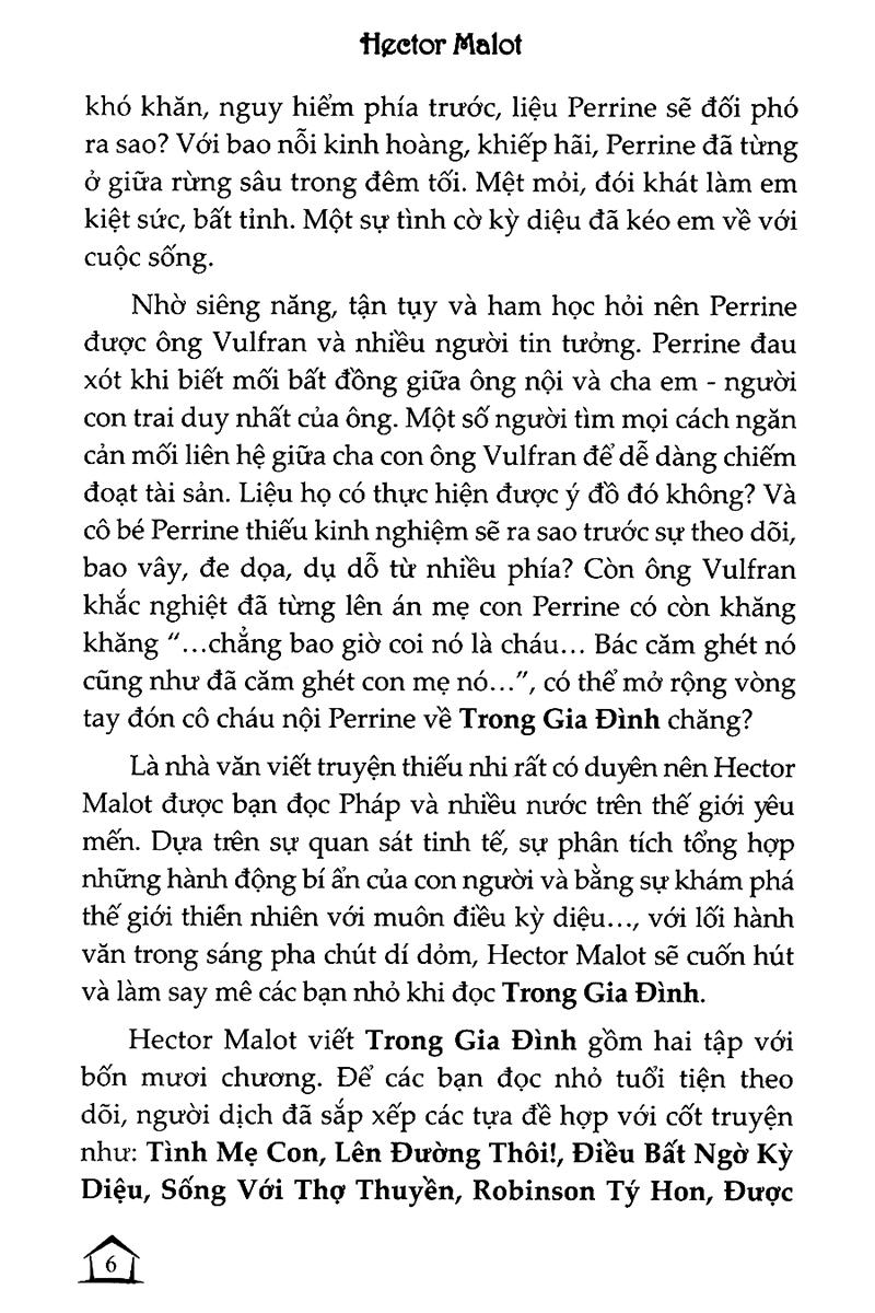 Mua tại TiktokTrong Gia Đình là một câu chuyện đẹp dành cho những em thiếu nhi và những ai đã trưởng thành. Đến với Trong Gia Đình chúng ta sẽ thấy được rằng nghịch cảnh có khó khăn đến mấy thì chỉ cần chúng ta có niềm lạc quan và biết lao động chăm chỉ thì cũng có thể vượt qua. Cách hành văn của Hector Malot có đôi chút hóm hỉnh, trong sáng, cách xây dựng nhân vật có cá tính rất riêng đã mang đến cho Trong Gia Đình một hơi thở độc đáo và tuyệt vời. Cùng với Không Gia Đình, Trong Gia Đình là một trong hai tác phẩm nổi triếng nhất của Hector Malot và đã từng đoạt giải thưởng của Viện Hàn Lâm văn học Pháp.