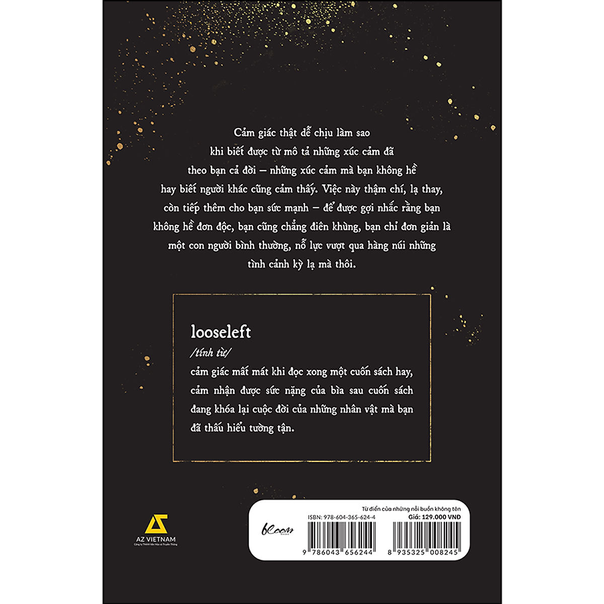 - John Koenig - Cảm giác thật dễ chịu làm sao khi biết được từ mô tả những xúc cảm đã theo bạn cả đời – những xúc cảm mà bạn không hề hay biết người khác cũng cảm thấy. Việc này thậm chí, lạ thay, còn tiếp thêm cho bạn sức mạnh − để được gợi nhắc rằng bạn không hề đơn độc, bạn cũng chẳng điên khùng, bạn chỉ đơn giản là một con người bình thường, nỗ lực vượt qua hàng núi những tình cảnh kỳ lạ mà thôi. looseleft /tính từ / cảm giác mất mát khi đọc xong một cuốn sách hay, cảm nhận được sức nặng của bìa sau cuốn sách đang khóa lại cuộc đời của những nhân vật mà bạn đã thấu hiểu tường tận. Thông tin tác giả: JOHN KOENIG sống tại Minnesota với vợ và con gái. Năm 2009, ông cho ra đời The Dictionary of Obscure Sorrows, khởi đầu là một trang blog tại địa chỉ , sau đó mở rộng thành loạt video trên YouTube. Cuốn sách của ông đã được John Green, từ tạp chí New York, và những người làm chương trình Radiolab dành lời khen ngợi.