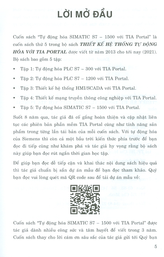 Suốt 8 năm qua , tác giả đã cố gắng hoàn thiện và cập nhật liên tục các phiên bản phần mềm TIA Portal cũng như tính năng sản phẩm trong từng lần tái bản của mỗi cuốn sách . Với tự động hóa của Siemens thì còn cả một bầu trời kiến thức phía trước để bạn đọc đi tiếp cũng như khám phá và tác giả hy vọng rằng bộ sách này giúp bạn đọc rút ngắn thời gian học tập . Để giúp bạn đọc dễ tiếp cận và khai thác nội dung sách hiệu quả thì tác giả chuẩn bị sẵn dự án mẫu để bạn đọc tham khảo . Quý bạn đọc vui lòng quét mã QR code sau để tải dự án mẫu về : Or Cuốn sách “ Tự động hóa SIMATIC S7 – 1500 với TIA Portal được tác giả danh nhiều công sức và tâm huyết để viết trong 3 năm . Cuốn sách thay cho lời cảm ơn sâu sắc của tác giả gửi tới Quý bạn.