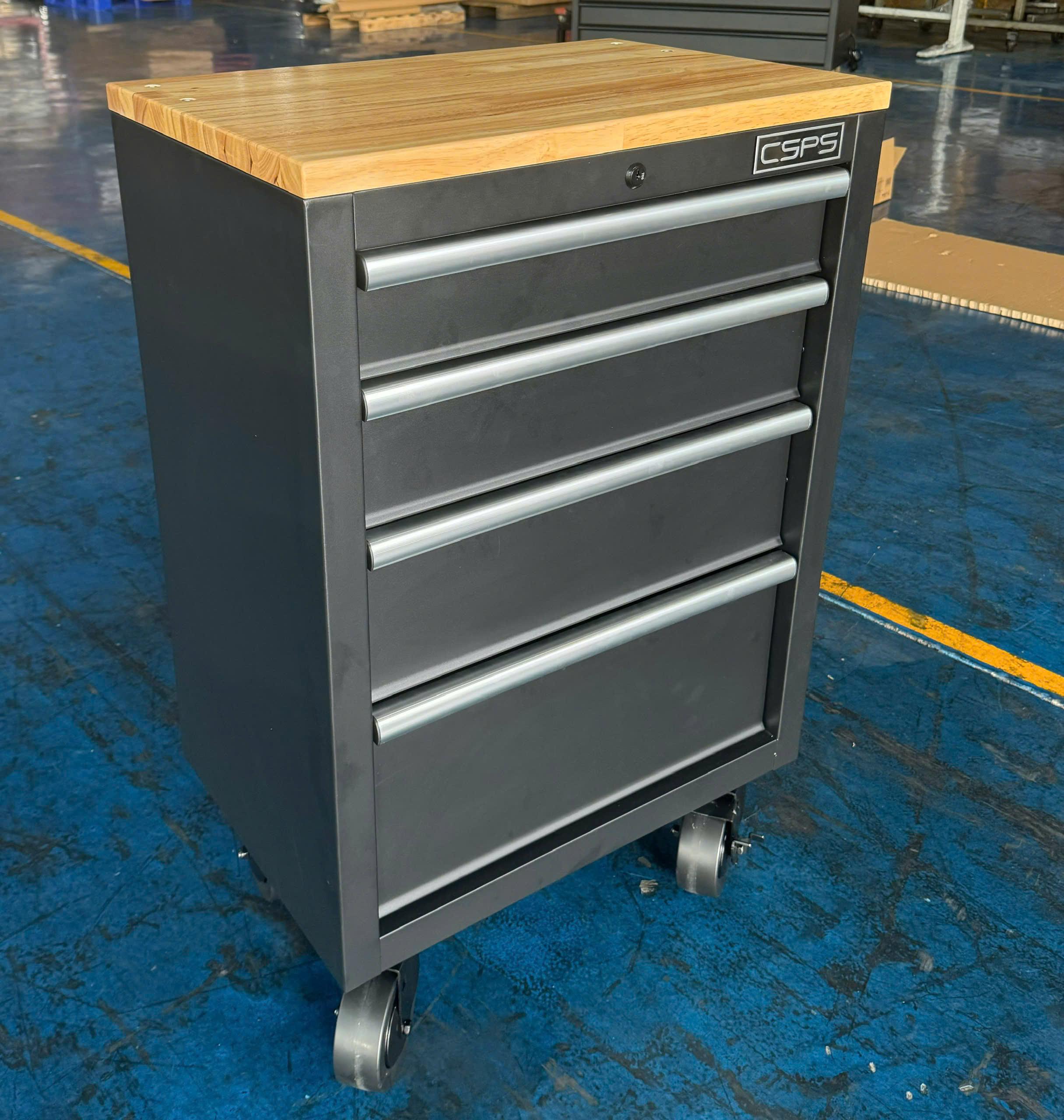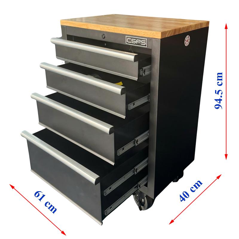 Tủ dụng cụ CSPS 61cm - 04 hộc kéo màu đen bánh xe ván gỗ (tay cầm trắng)