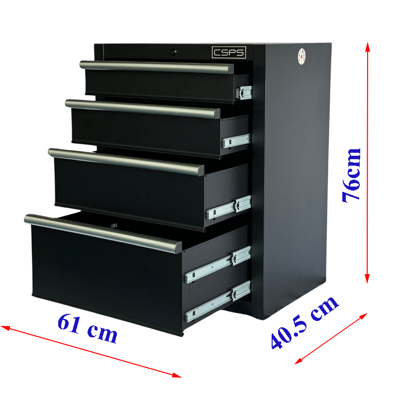 - Tủ dụng cụ CSPS 61cm - 04 hộc kéo màu đen chân tăng chỉnh (tay cầm trắng) - THÔNG SỐ CHUNG Kích thước đóng gói/ Package dimension: 62cm W x 43cm D x 78.5cm