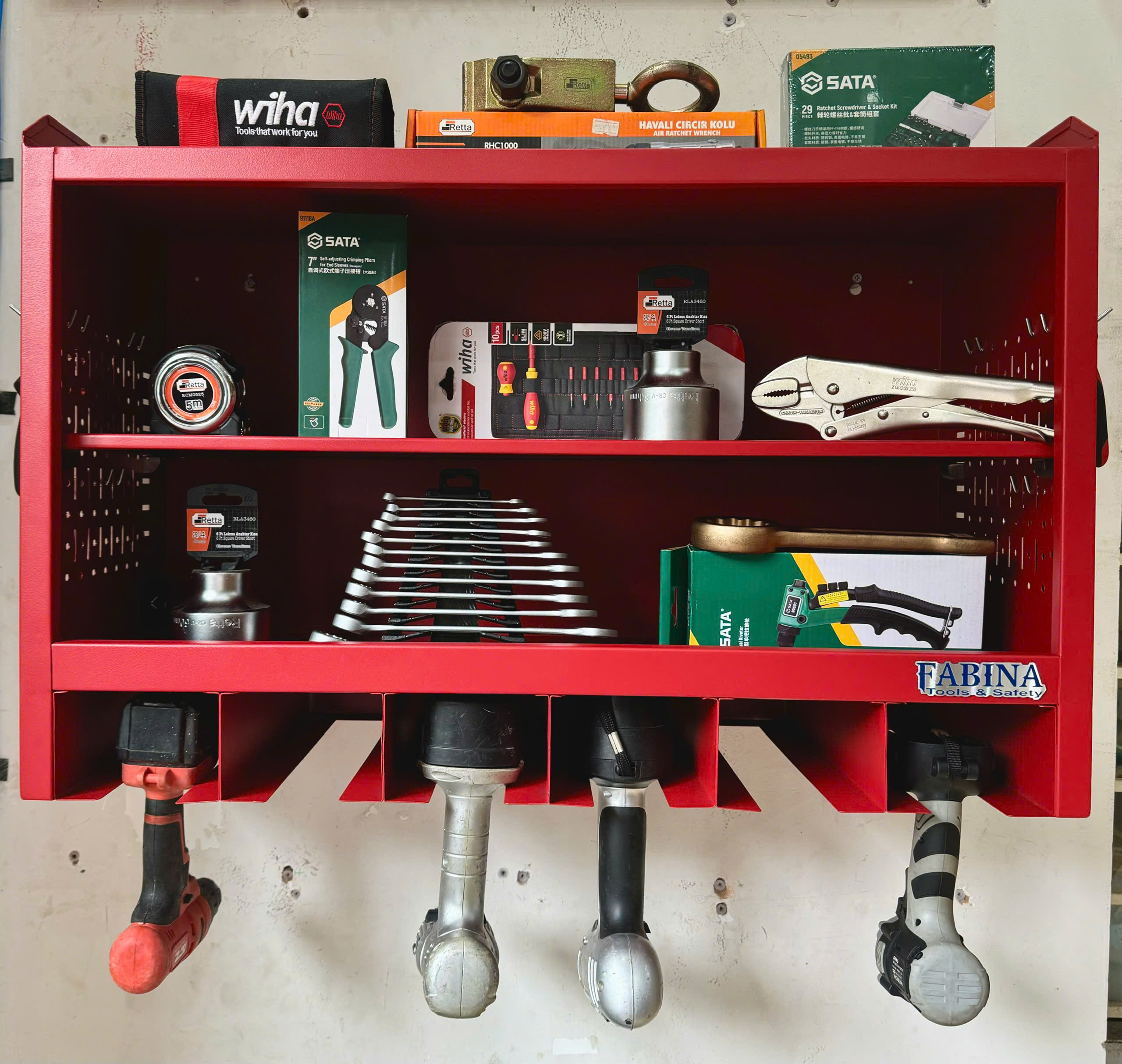 Tủ dụng cụ CSPS 61cm - 01 hộc kéo màu đỏ ván gỗ vách lưới 1.THÔNG SỐ CHUNG Kích thước đóng gói/ Package dimension: 62cm W x 43cm D x 78.5cm H Kích thước sản