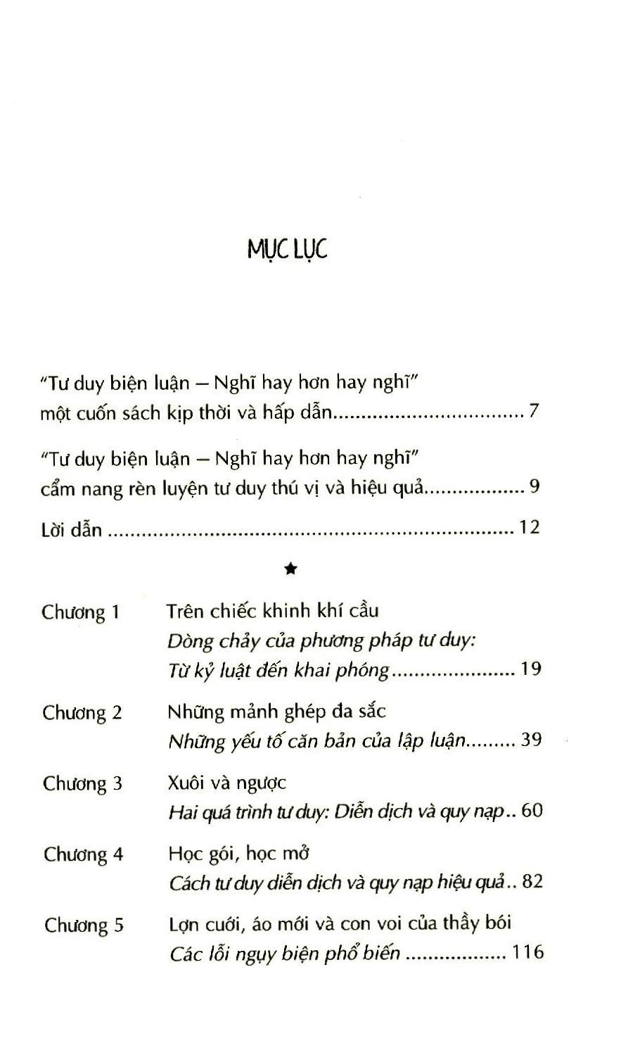 Những nội dung trình bày trong cuốn sách sẽ đưa bạn đi từ những khái niệm cơ bản nhất, khám phá dòng chảy tư duy từ cổ đại với tam đại triết gia Plato, Socrates, Aristotle đến hiện đại với “bậc thầy của tư duy sáng tạo” – Bono, sau đó tìm hiểu những yếu tố căn bản của lập luận và những lỗi ngụy biện phổ biến. Và “tri thức chưa có sức mạnh chừng nào còn chưa được áp dụng” – Dale Carnegie, phần quan trọng của cuốn sách là hướng dẫn bạn phương pháp rèn luyện tư duy qua những tình huống đa dạng, sinh động trong đời sống. Phong cách viết gần gũi, sinh động, gợi mở, cuốn sách phù hợp với mọi đối tượng độc giả, đặc biệt học sinh, sinh viên.