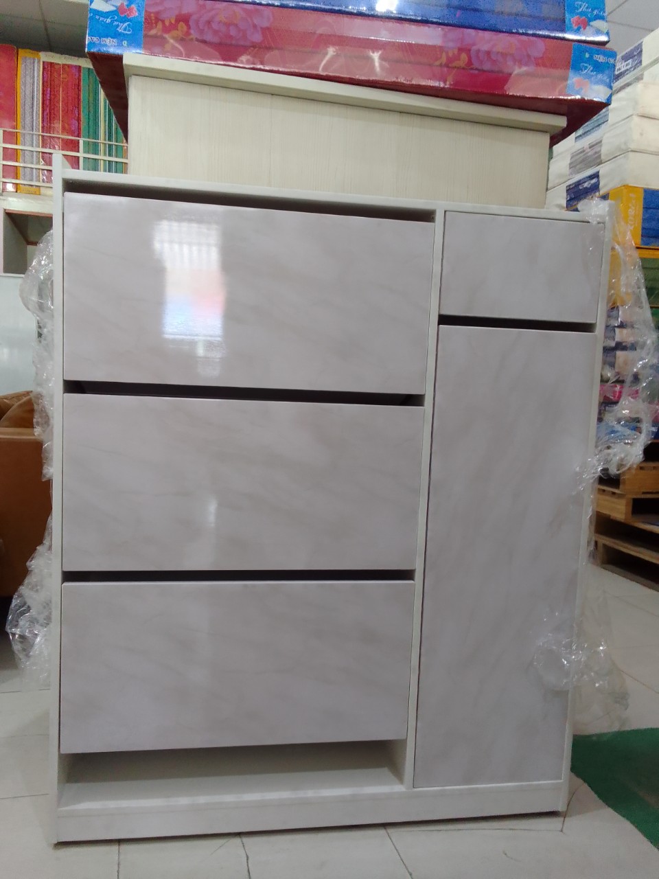 Tên sản phẩm: TỦ GIÀY 026 Mã sản phẩm: TG026 Kích thước: dài 1200 x rộng 320 x cao 1000mm Mô tả: 3 hộc cánh mở, 1 hộc kéo, 4 hộc tróng tiện dụng Vật