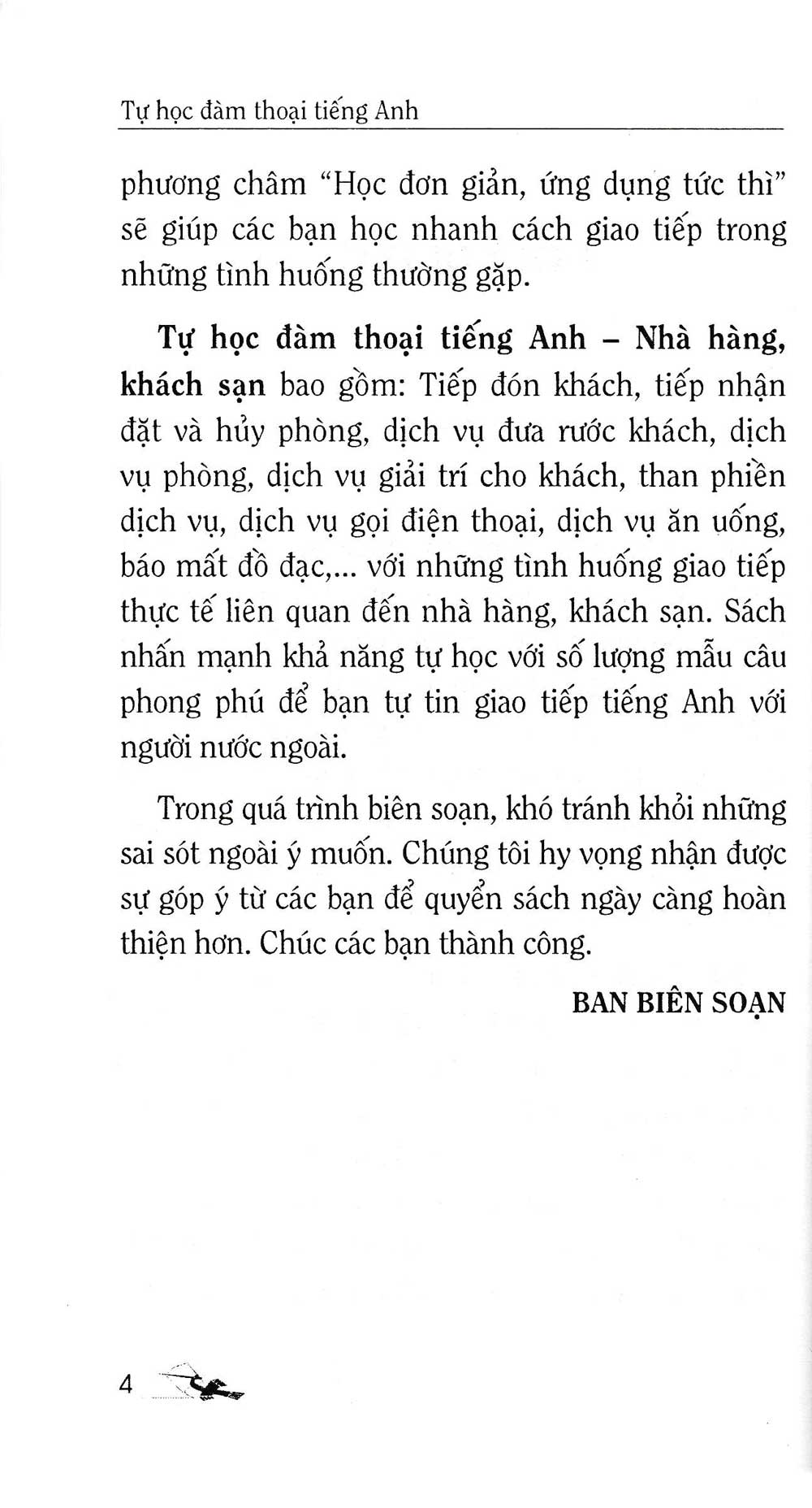 Với mục tiêu hỗ trợ những ai muốn bắt đầu sự nghiệp trong lĩnh vực này, cuốn sách không chỉ là một nguồn tư liệu học tập mà còn là một công cụ hữu ích để chuẩn bị cho các tình huống giao tiếp phổ biến trong ngành. Nhờ vào nội dung chuyên sâu và dễ tiếp cận, đây thực sự là một nguồn tài liệu đáng giá cho bất kỳ ai muốn nâng cao trình độ tiếng Anh chuyên ngành nhà hàng - khách sạn.